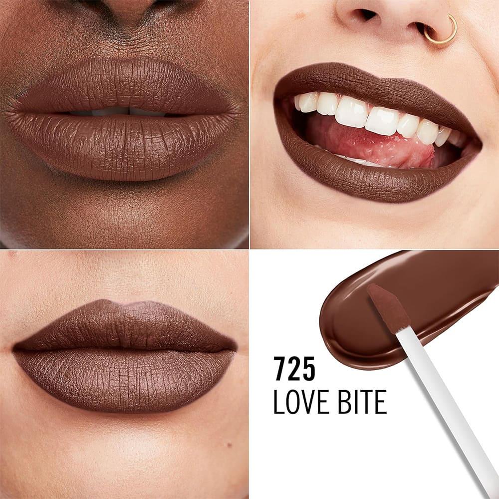 أحمر شفاه سائل من ريميل لندن بتركيبة مات في اللون رقم 725 لوف بايت هو لون أحمر عميق وجريء. يوفر مظهراً ملفتاً وجذاباً مع لمسة نهائية غير لامعة، مما يجعله مثالياً لإطلالة مسائية دراماتيكية أو في أي وقت ترغبين فيه بلفت الأنظار. تركيبة السائل تضمن تطبيقاً سلساً وثباتاً طويلاً.