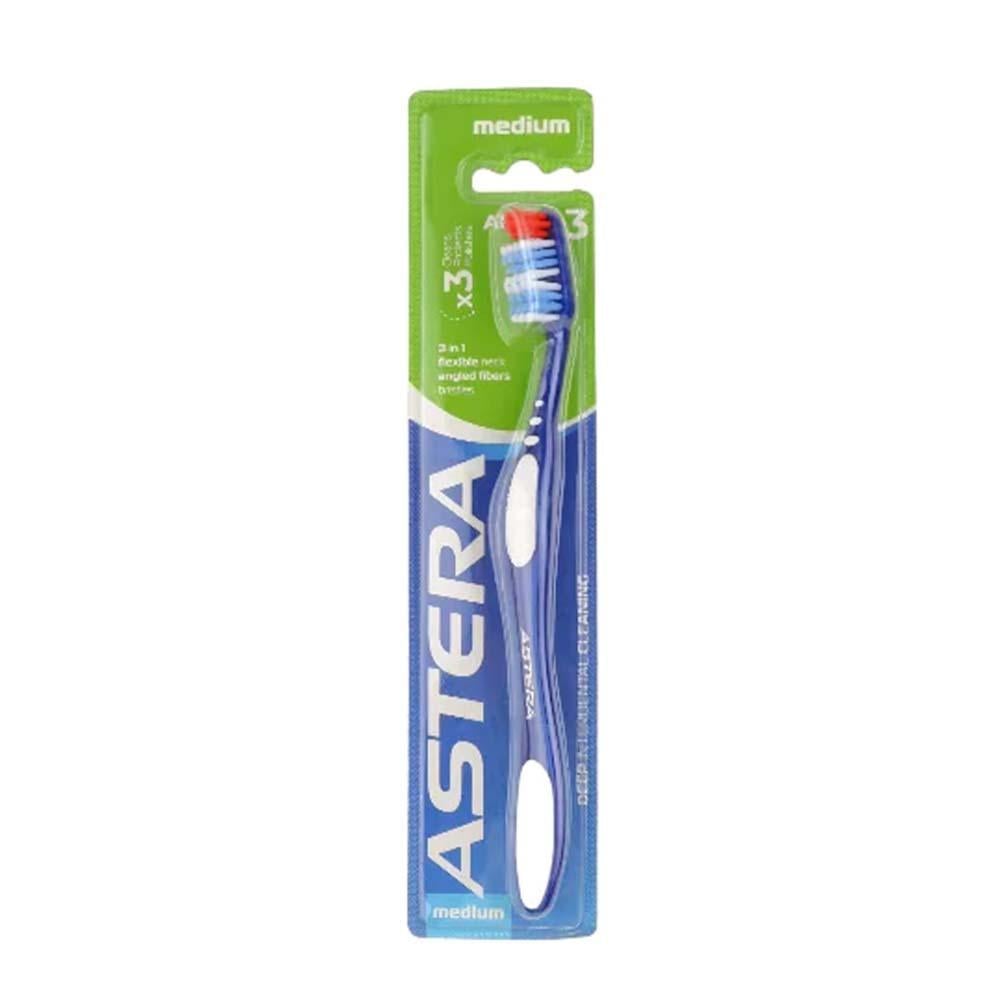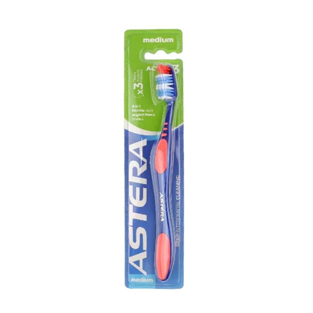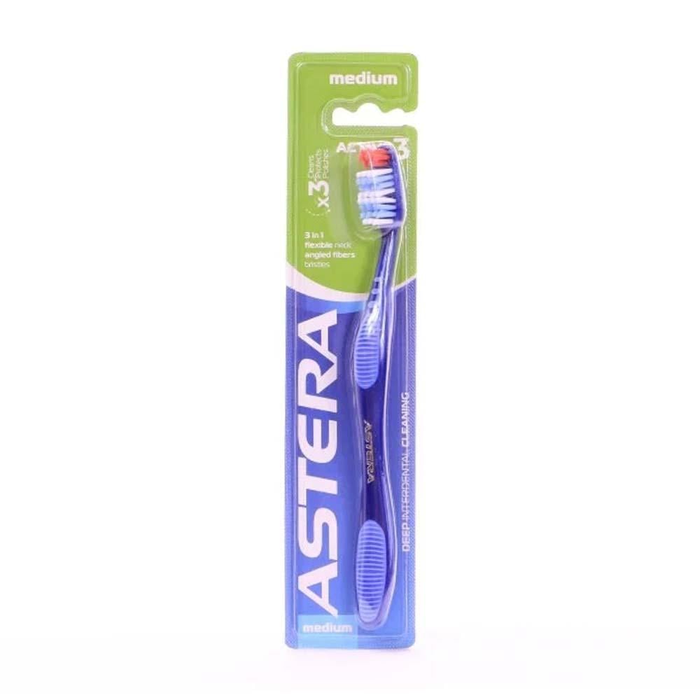 الوصف: “استيرا أكتيف 3 فرشاة أسنان متوسطة النعومة” فرشاة أسنان مصممة لتوفير تنظيف فعال ولطيف للأسنان واللثة. تأتي بشعيرات متوسطة النعومة تناسب جميع أنواع الأسنان وتضمن إزالة البلاك بفعالية. فوائد ومميزات: شعيرات متوسطة النعومة تضمن إزالة البلاك والشوائب من الأسنان بفعالية. مصممة لتكون لطيفة على اللثة وتقلل من خطر التهيج أو النزيف. مقبض مريح يوفر قبضة جيدة ويساعد في تنظيف جميع زوايا الفم بسهولة. رأس الفرشاة مصمم للوصول إلى الأماكن الصعبة في الفم مثل الأضراس الخلفية. تساعد في الحفاظ على صحة الأسنان وتقوية مينا الأسنان مع الاستخدام المنتظم. يمكن استخدامها من قبل البالغين والأطفال الأكبر سنًا. تساعد في تدليك اللثة وتحفيز الدورة الدموية فيها، مما يعزز صحة الفم بشكل عام. طريقة أستعمال: ضع كمية مناسبة من معجون الأسنان على فرشاة الأسنان. نظف أسنانك بلطف بحركات دائرية، مع التأكد من الوصول إلى جميع أجزاء الفم. استمر في تنظيف الأسنان لمدة دقيقتين تقريبًا. اغسل فرشاة الأسنان جيدًا بعد الاستخدام واتركها لتجف في مكان نظيف وجاف. التحذيرات: يحفظ في مكان بارد وجاف. يُحفظ بعيدًا عن متناول الأطفال الصغار. لا تستخدم الفرشاة لفترة طويلة، يُنصح بتغيير فرشاة الأسنان كل 3 أشهر أو عندما تتآكل الشعيرات.