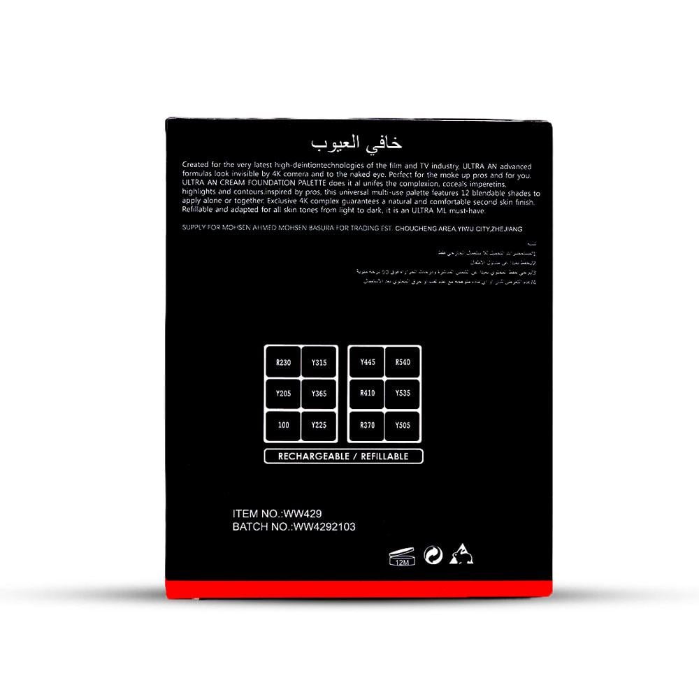 باليت كريم أساس ULTRA AN CREAM يعمل على توحيد لون البشرة وإبرازات وخطوط مستوحاة من المحترفين. تتميز هذه اللوحة العالمية متعددة الاستخدامات ، المستوحاة من المحترفين ، بـ 12 لونًا قابلاً للمزج لتطبيقها بمفردها أو معًا. يضمن مجمع 4K الحصري لمسة نهائية طبيعية ومريحة للجلد الثاني. يمكن إعادة تعبئته وتكييفه مع جميع ألوان البشرة من الفاتح إلى الداكن ، وهو منتج لا غنى عنه في الحصول على ML ULTRA ML.