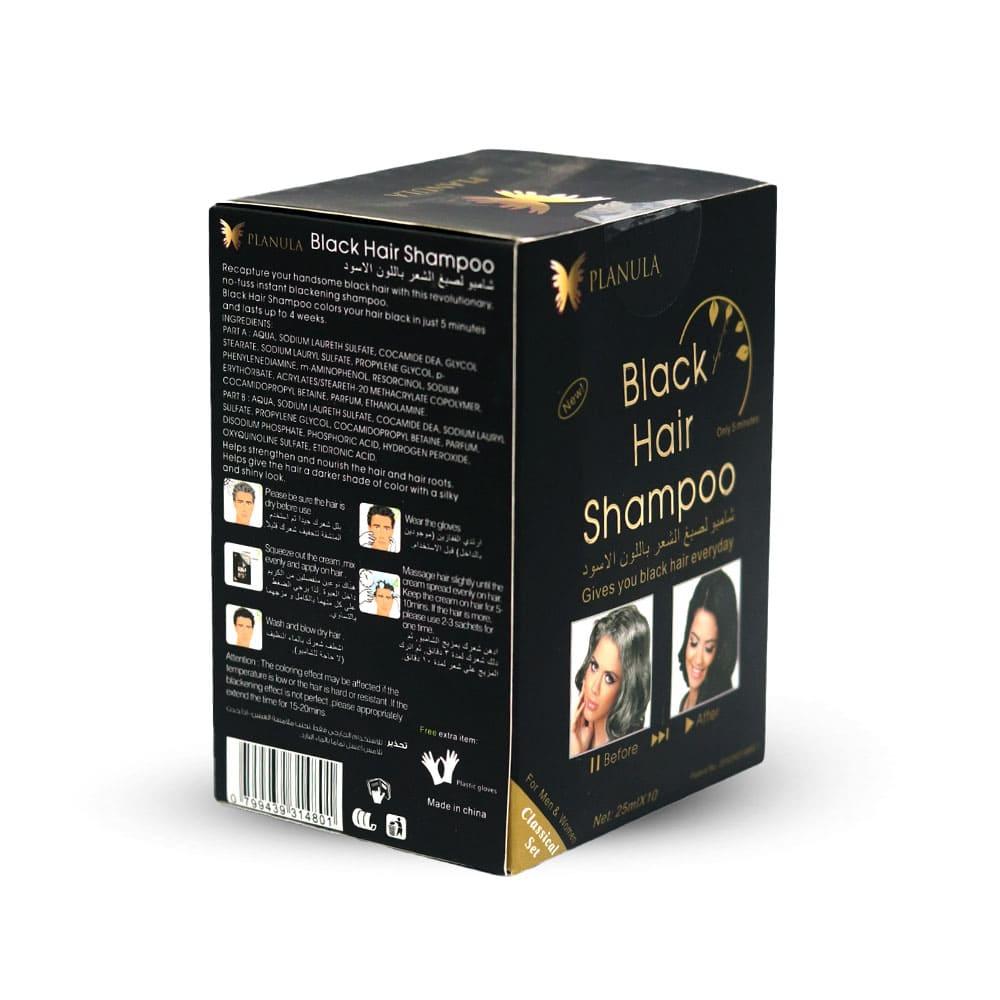 الوصفاستعد شعرك الأسود الجميل مع شامبو التبييض الفوري الثوري بلا ضجة.فوائد:شامبو الشعر الأسود يصبغ شعرك باللون الأسود في 5 دقائق فقط ويستمر حتى 4 أسابيعيساعد في تقوية وتغذية الشعر وجذور الشعر. يساعد على إعطاء الشعر لونًا أغمق مع مظهر حريري ولامع.المحتويات:10 أكياس شامبو – 25جمقفازات يد – 10 قفازاتطريقة الاستخدام:يرجى التأكد من أن الشعر جاف قبل الاستخداماعصري مزيج الكريم بالتساوي وضعيه على الشعراغسل الشعر الجاف وضربهارتدِ القفازاتدلكي الشعر قليلاً حتى ينتشر الكريم بالتساوي على الشعر ، اتركي الكريم على الشعر لمدة 5-10 دقائق. إذا كان الشعر أكثر يرجى استخدام 2-3 أكياس لمرة واحدة.