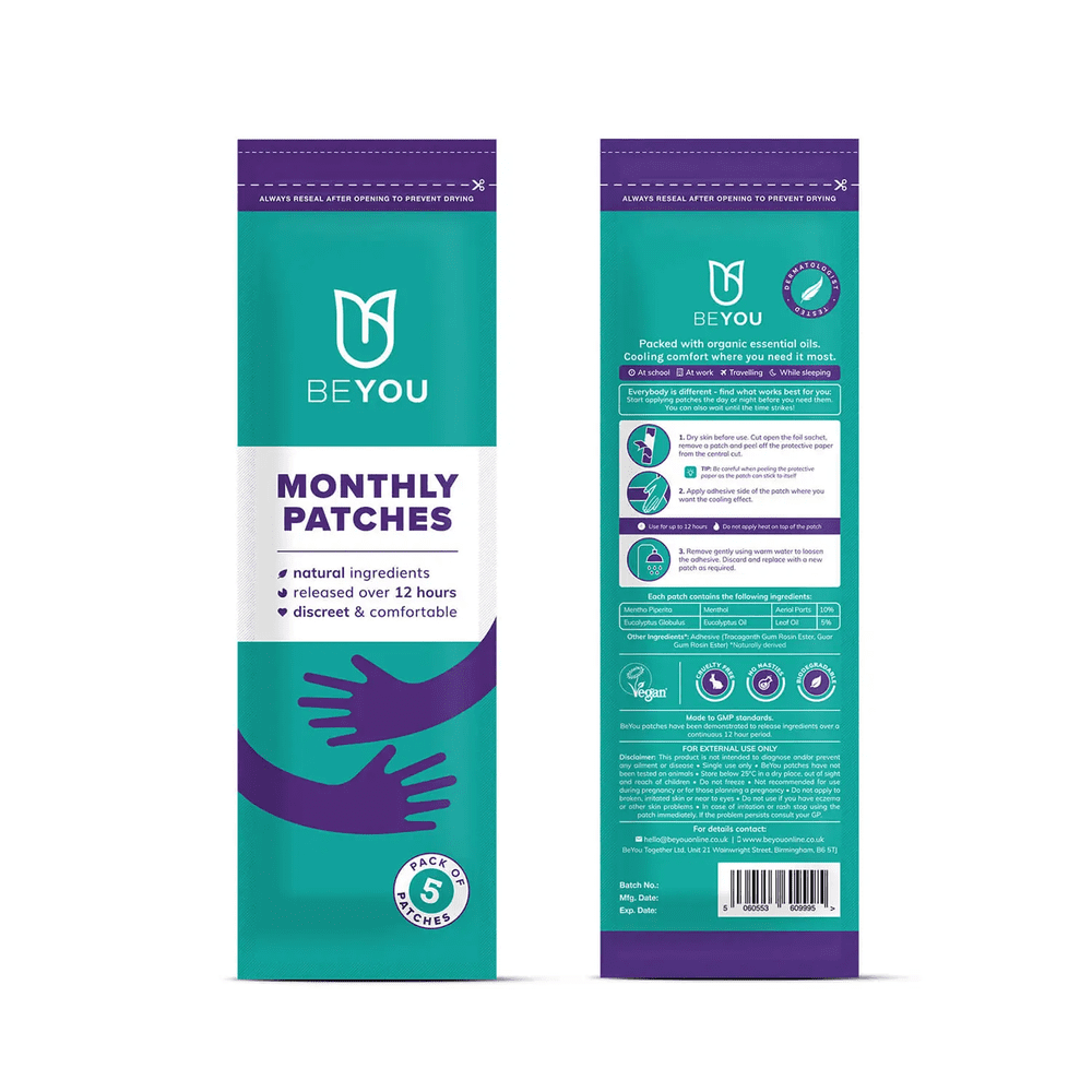 لاصقة ذكية من بي يو تساعدك في تخفيف آلام الدورة الشهرية والتقلصات ، لاصقات BeYou الشهرية طبيعية 100٪ ومصنوعة من الأوكالبتوس المقطر بالبخار والمنثول المشتق من النعناع الذي يخلق وخزاً للتبريد عند الاستخدام.