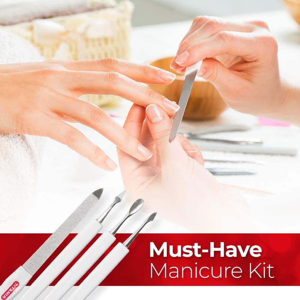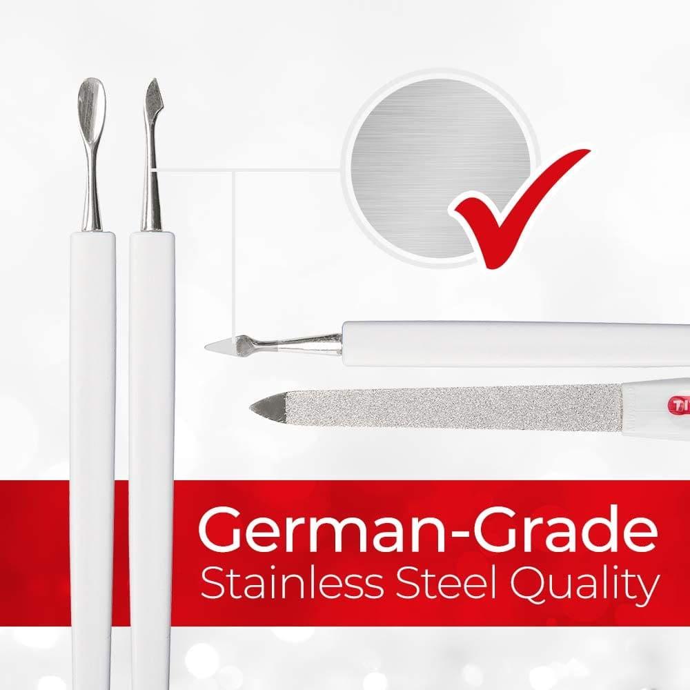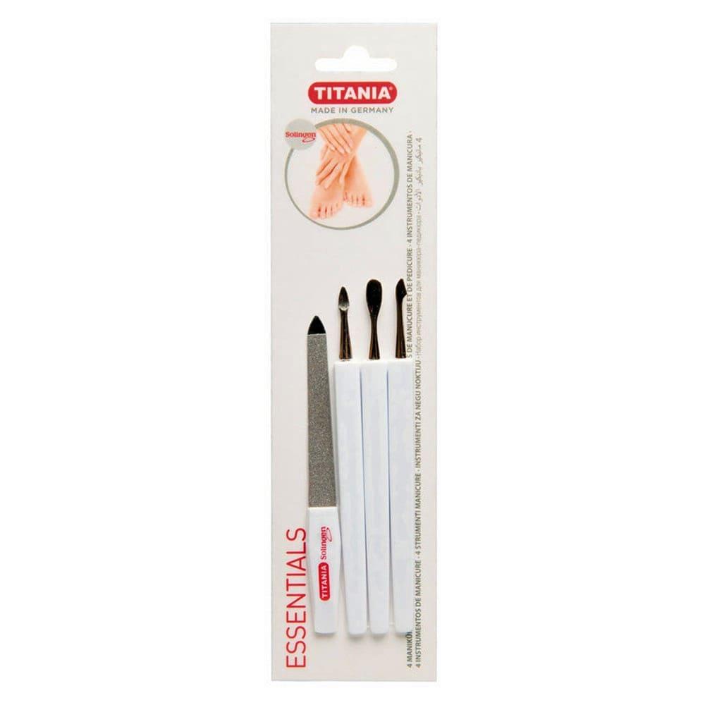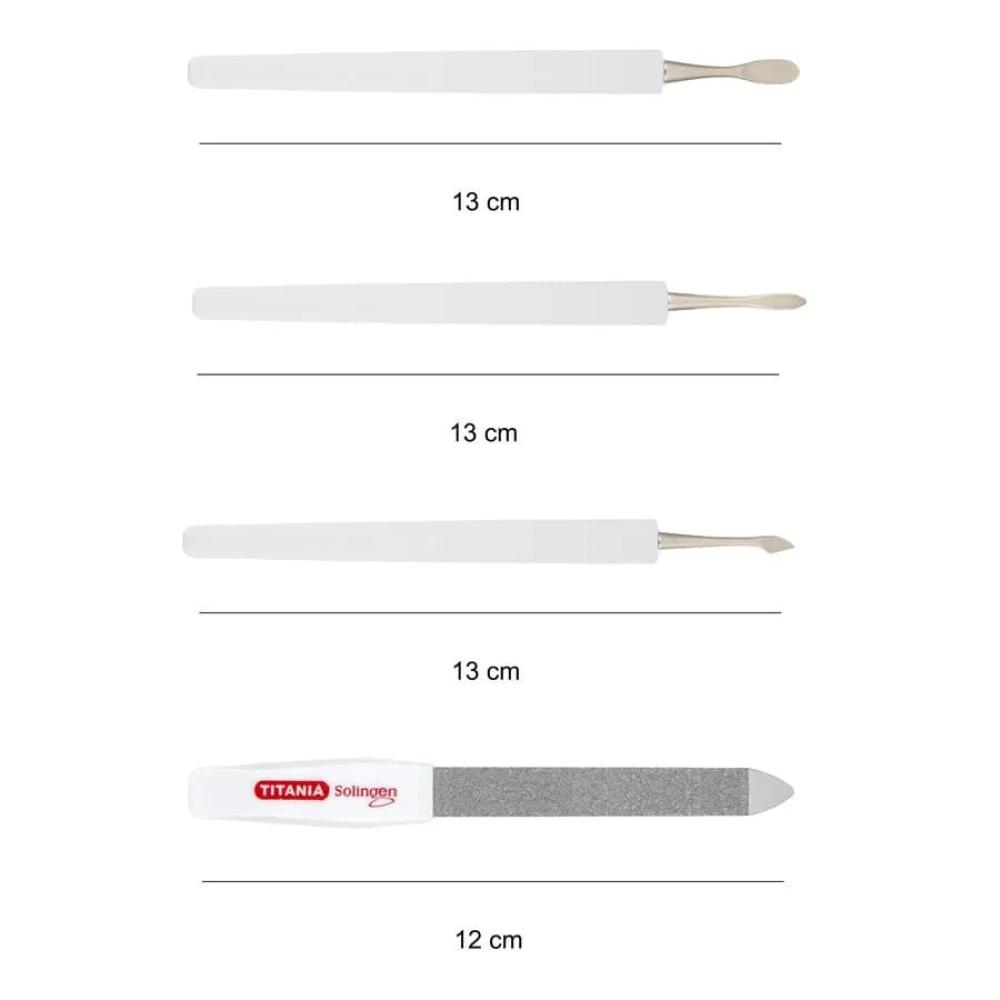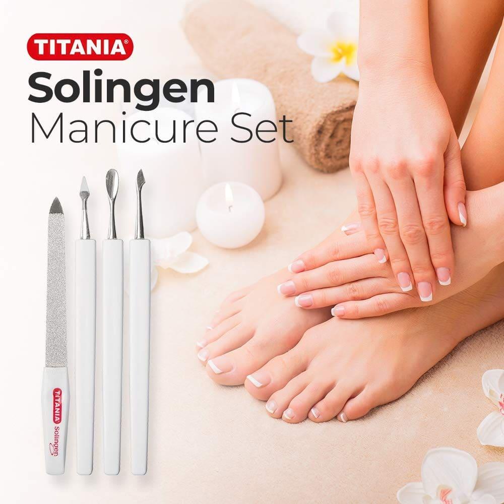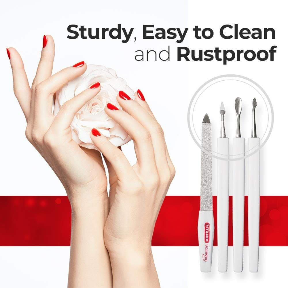 تيتانيا طقم اظافر طقم للعناية بالأظافر4 قطع 1020 مثالية لحالات الطوارئ وتتناسب بسهولة وسرعة في جيبك أو حقيبتك.طقم مانيكير من الدرجة الممتازة من المصنع الألماني.تم تطويرها بخبرة باستخدام الفولاذ المقاوم للصدأ عالي الجودة من الجودة الألمانية.تتميز مجموعة مانيكير تيتانيا بجودة مقاومة للصدأ وسهلة التنظيف، مع متانة طويلة الأجل ويمكن استخدامها لعدة أشهر.توفر مجموعة مانيكير العناية بالأظافر من تيتانيا كل ما تحتاجه للعناية بأصابعك، وإزالة التشققات، وتنظيف الأظافر وتقليمها للحفاظ على يديك نظيفة ومرتبة للحصول على مظهر صحي وعناية جيدة.قلمي أظافرك، وقللي حجم الجلد الميت، ونظفي أظافرك.تشتمل مجموعة مانيكير العناية بالأظافر من تيتانيا على أربع أدوات فولاذية بجودة سولينجن بحيث يمكنك التمتع بأيدٍ صحية طوال الوقت.يسهل الحجم الصغير والدقيق لمجموعات العناية بالأظافر هذه وضعها في أدراج السرير في المنزل أو حملها في محفظتك أو حقيبتك للعناية بالأظافر والجلد عند الخروج.