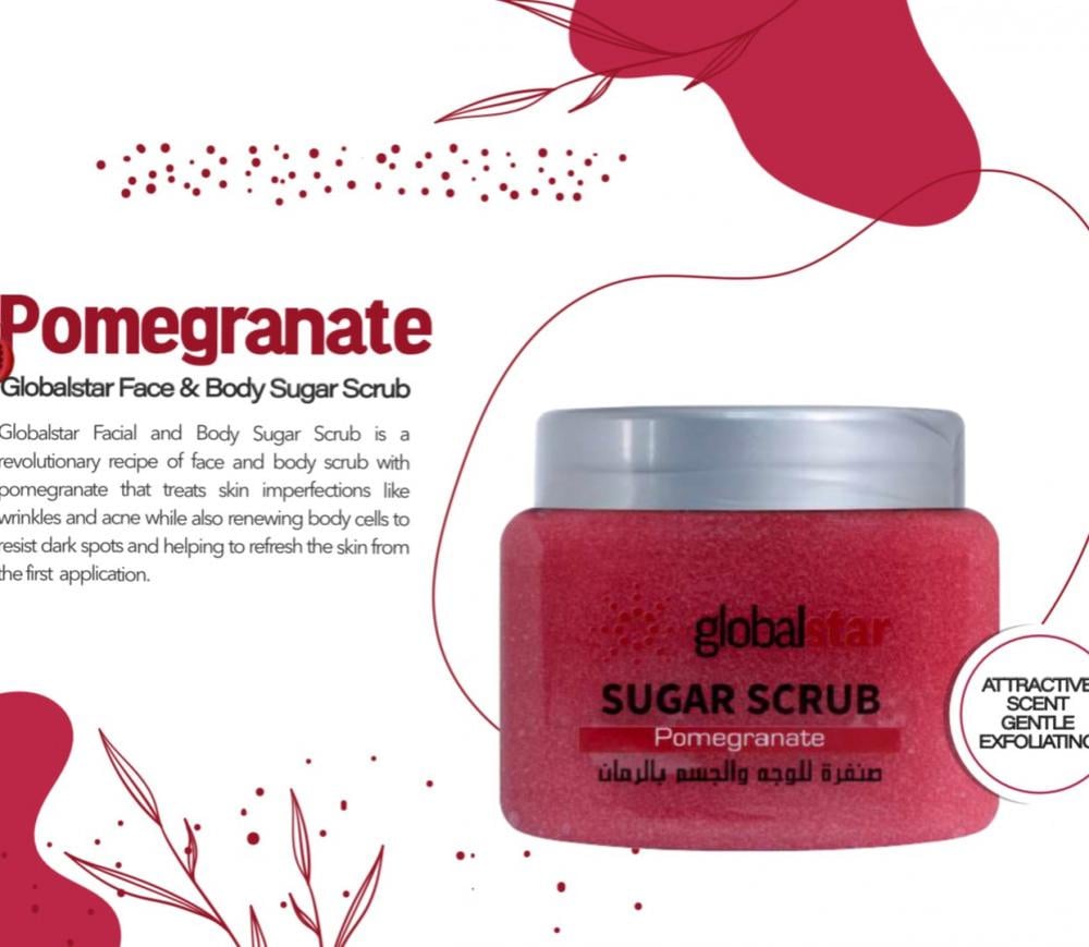 مقشر السكر للوجه والجسم من جلوبال ستار تركيبة جديدة في عالم تقشير الجسم والوجه تعمل على تقشير خلايا الجلد وازالة الخلايا الميتة وهذه الاحماض تحفز نمو خلايا جديدة وتساعد على فتح المسام في الجلد ، ويحافظ أيضًا على مرونته. يتخلص الجلد أيضًا من الرؤوس السوداء التي تظهر على الوجه ويفتح لون البشرة ؛ يخفف من حروق الشمس.