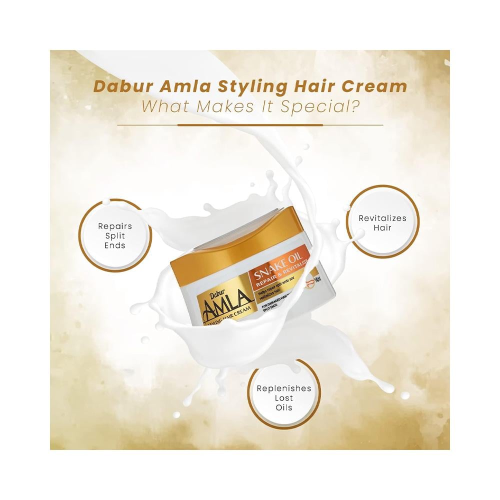 دابر أملا كريم تصفيف الشعر بزيت الحية إصلاح وتنشيط هو كريم غني بالمكونات الطبيعية التي تُغذي الشعر وتُقوّيه وتُصلحه. يحتوي الكريم على زيت الحية، زيت أملا، زيت اللوز، والبروتين، وهي مكونات تُساعد على إصلاح الأطراف المتقصفة، ترطيب الشعر، تنعيمه، وإضفاء لمعانٍ عليه.