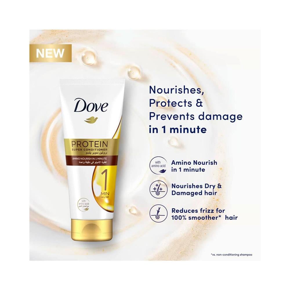 بمرور الوقت ، يمكن أن يؤثر الروتين المزدحم والتصميم اليومي على شعرك. هل تعتقد أنه ليس لديك الوقت الكافي لإجراء علاج مكثف للشعر المتضرر والجاف؟يجعل بلسم دوف سوبر بروتين سوبر للشعر من السهل منح شعرك أفضل عناية يومية. يستغرق الأمر دقيقة واحدة فقط في روتينك المعتاد للعناية بالشعر لمساعدة شعرك على التعافي من التلف الناتج عن التصفيف بالحرارة وعلاجات الصبغة وإعطائه دفعة ترطيب. احصلي على شعر جميل بشكل مذهل في دقيقة واحدة فقطمع بلسم دوف سوبر.تساعد تركيبة الأحماض الأمينية المركزة والفعالة في بلسم دوف الأميني المغذي الفائق على تقليل التجعد وتغذية الشعر الجاف بعمق ، مما يجعله أكثر نعومة بنسبة 100٪ * في دقيقة واحدة فقط!لشعر أكثر جمالاً وقوة: اسكبي كمية من بلسم الشعر بحجم عملة معدنية على راحة يدك. ضعيه على الشعر المبلل من المنتصف إلى الأطراف. تجنب الجذور. اتركيه لمدة 1 دقيقة. شطف. استخدمي Dove Super Conditioner بعد أو كبديل لمكيفاتك العادية.للحصول على أفضل النتائج ، استخدمي دوف شامبو ومنتجات تصفيف الشعر للمساعدة في الحفاظ على شعرك في أفضل حالاته.حوّل روتين العناية بشعرك إلى علاج مغذي بعمق مع دقيقة واحدة فقط من عناية دوف فائقة التكييف.