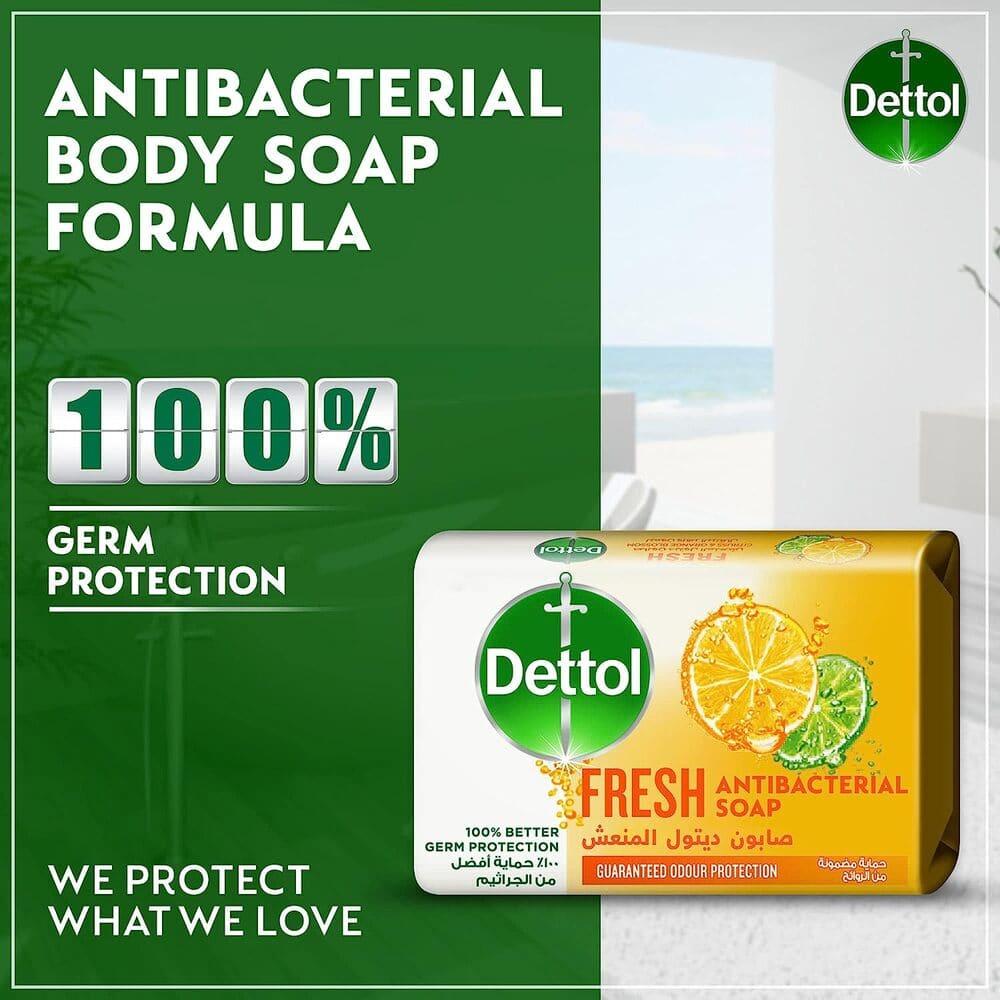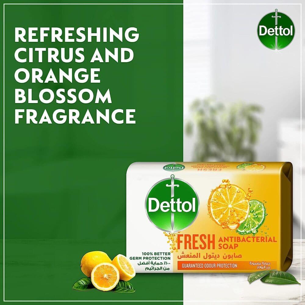 الوصف:صابون ديتول المنعش بالليمون وزهر البرتقال يحتوي على مجموعة من المكونات التي تساعد في تنظيف وترطيب البشرة وتحميها من الجراثيم والبكتيريا التي قد تؤدي إلى ظهور حب الشباب والتهابات الجلد ومن بين فوائد هذا الصابون. الفوائد والمميزات:يساعد في تنظيف البشرة بعمق وإزالة الشوائب والأوساخ.يحتوي على خلاصة الليمون وزهر البرتقال التي تعمل على تفتيح البشرة وتوحيد لونها.يحتوي على مادة الجليسرين التي ترطب البشرة وتحافظ على نعومتها ومرونتها.يحتوي على مضادات الأكسدة التي تحمي البشرة من الجذور الحرة وتؤخر عملية الشيخوخة.يحتوي على مواد مضادة للجراثيم والبكتيريا، مما يساعد على حماية البشرة من الالتهابات والحبوب.يتميز برائحته المنعشة والمميزة التي تستمر على البشرة لفترة طويلة.يمكن استخدامه بسهولة في الحمام أو أثناء الاستحمام للحصول على بشرة نظيفة وصحية. طريقة الأستعمال:بللي الصابونة بالماء ثم قومي بوضعه مباشرة على البشرة مع عمل حركات دائرية حتى تتكون رغوة.اشطفي جيدا بالماءالتحذيرات:للاستخدام الخارجي فقط.تُحفظ بعيداً عن متناول الأطفال.يحفظ في مكان بارد وجاف.