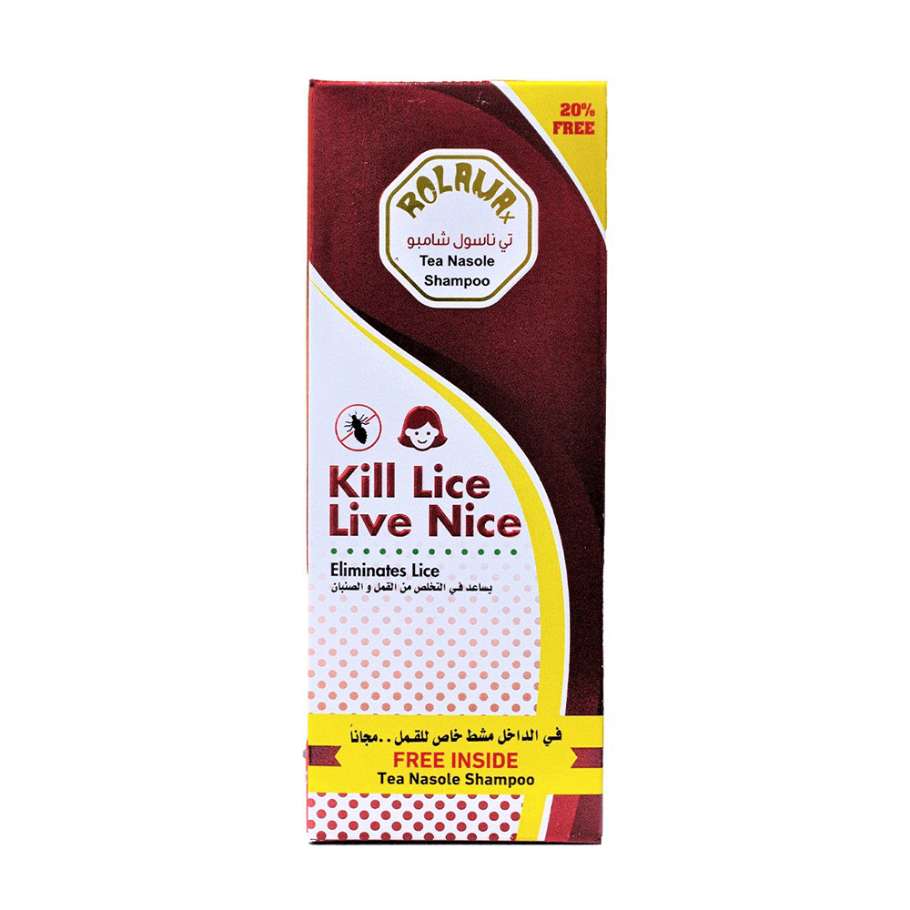رولاماكس تي ناسول شامبو يساعد في التخلص من القمل والصئبان مع مشط خاص بالقمل مجاناً بداخل العلبة – لون أحمر.طريقة الاستعمال:بللي الشعر وضعي كمية مناسبة من الشامبو ودلكي حتى تغطي كافة الرأس.دلكي جيدا الشعر وفروة الرأس بأطراف الأصابع (خصوصا خلف الأذنين) لمدة اربع دقائقاشطفيه بالماء جيدامشطي الشعر بمشط رولاماكس الخاص بالقملجففي الشعرهذه الطريقة ولمرة واحدة تجعل الشعر ناعماً ونظيفاً ولكن في الحالات الصعبة يمكن أن تكون لمرتين أو ثلاث مرات لمدة أربعة أيام يوماً بعد يوم.التحذيرات:اغسلي الملابس والملايات المتأثرة وكذلك اعتني بشعر باقي أفراد الأسرة خوفاً من العدوى وفي حالة وجود اي قمل او بويضات استخدمي شامبو رولاماكس ضد القمل فوراً.للإستعمال الخارجي فقط .تجنبي ملامسة العين أو الأعضاء الحساسة الأخرى وفي حالة إصابة العين أو أي جزء حساس أخر تتم معالجته بغسله بكمية وفيرة من الماء النظيف.ابعدي المنتج عن متناول الأطفال.