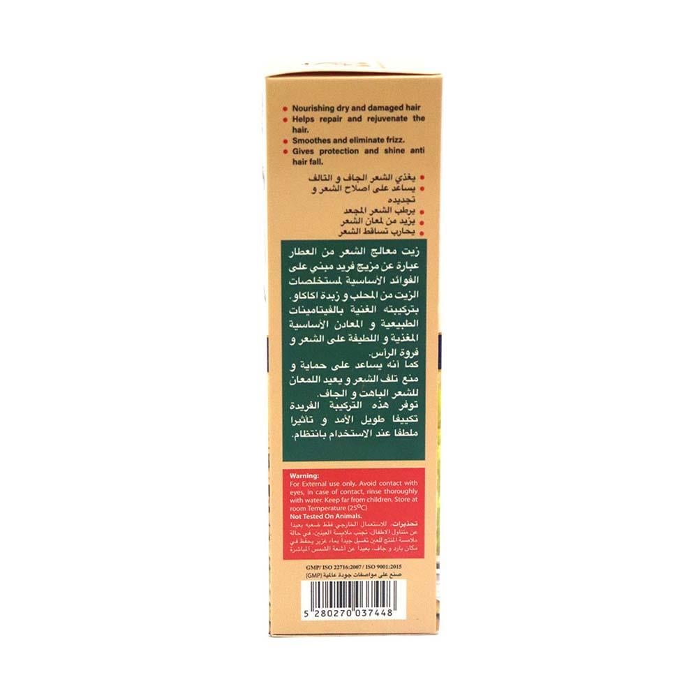 زيت معالج الشعر من العطار عبارة عن مزيج فريد مبني على الفوائد الأساسية لمستخلصات الزيت من المحلب وزبدة الكاكاو بتركيبته الغنية بالفيتامينات الطبيعية و المعادن الأساسية المغذية و اللطيفة على الشعر و فروة الرأس كما أنه يساعد على حماية و منع تلف الشعر و يعيد اللمعان للشعر الباهت و الجاف توفر هذه التركيبة الفريدة ترطيبا طويل الأمد و تأثيرا ملطفا عند الاستخدام بانتظام.