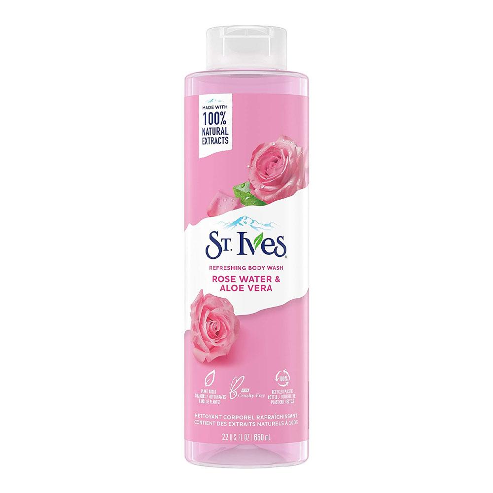 سائل استحمام سانت آيفز بخلاصة ماء الورد والصبار هو غسول جسم منعش ينظف ويلطف البشرة.