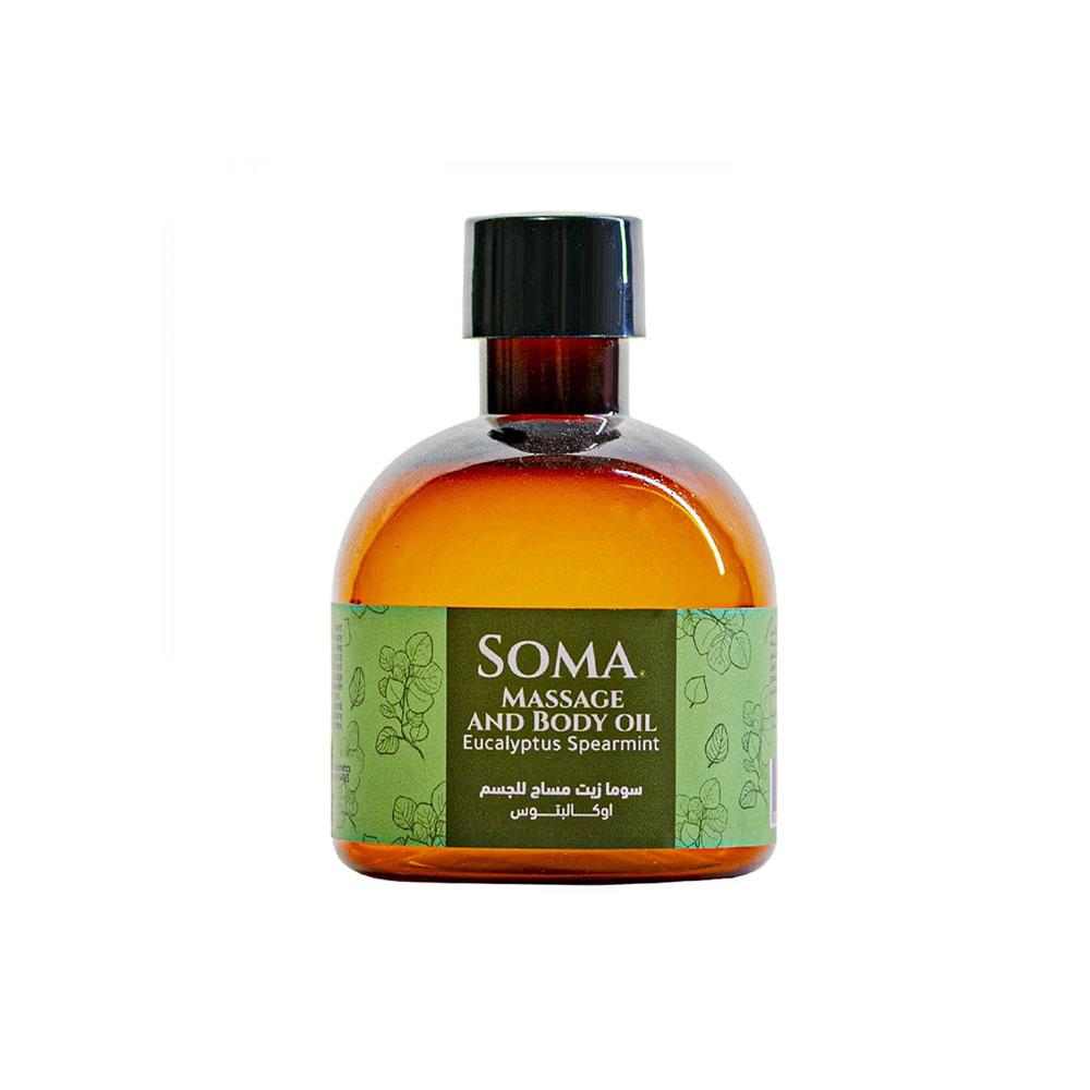 زيت مساج للجسم من سوما برائحة الأوكالبتوس المنعشة. غني بالزيوت الطبيعية التي تُغذي وتُرطب البشرة وتُنعّمها. يُساعد على الاسترخاء وتخفيف التوتر، كما يُعزز الشعور بالراحة ويُحسّن جودة النوم.