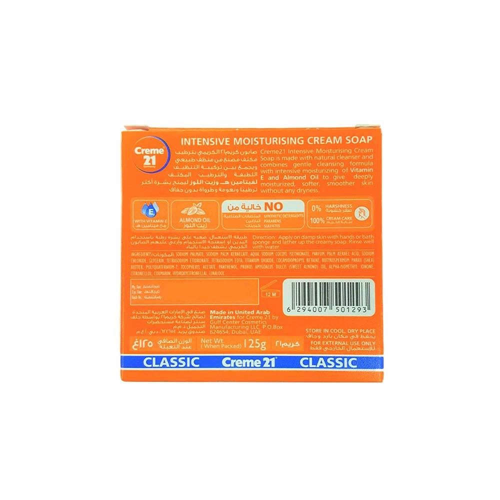 كريم 21 صابون كريمي بترطيب عالي المعزز بفيتامين E وزيت اللوز يعمل على ترطيب وتغذية البشرة بعمق يحتوي على تركيبة خاصة الذي يعمل على تشكيل حاجز حماية على سطح البشرة للحفاظ على الترطيب بالإضافة إلى فيتامين E وزيت اللوز التي تعززان من تجديد وترطيب البشرة .