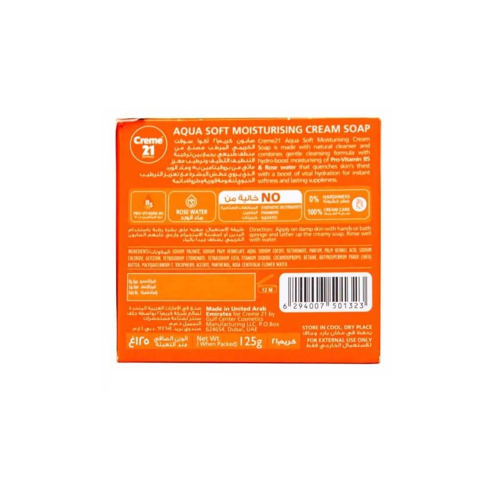 كريم 21 صابون كريمي مرطب أكوا سوفت يحتوي على برو فيتامين ب وماء الورد لترطيب وتنظيف البشرة بعمق يحتوي على تركيبة خاصة الذي يعمل على تشكيل حاجز حماية على سطح البشرة للحفاظ على الترطيب بالإضافة إلى برو فيتامين ب وماء الورد التي تعززان من تحسين مرونة البشرة وترطيبها.