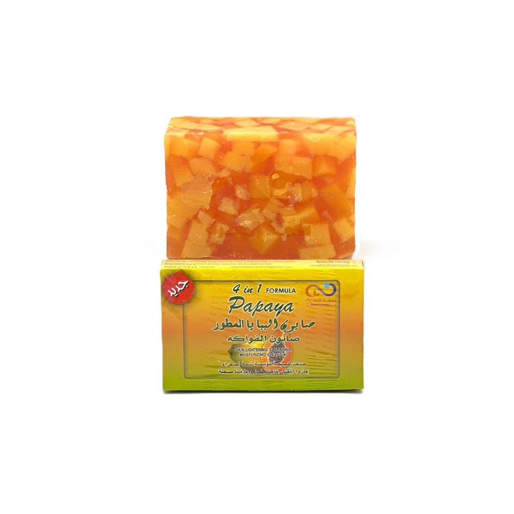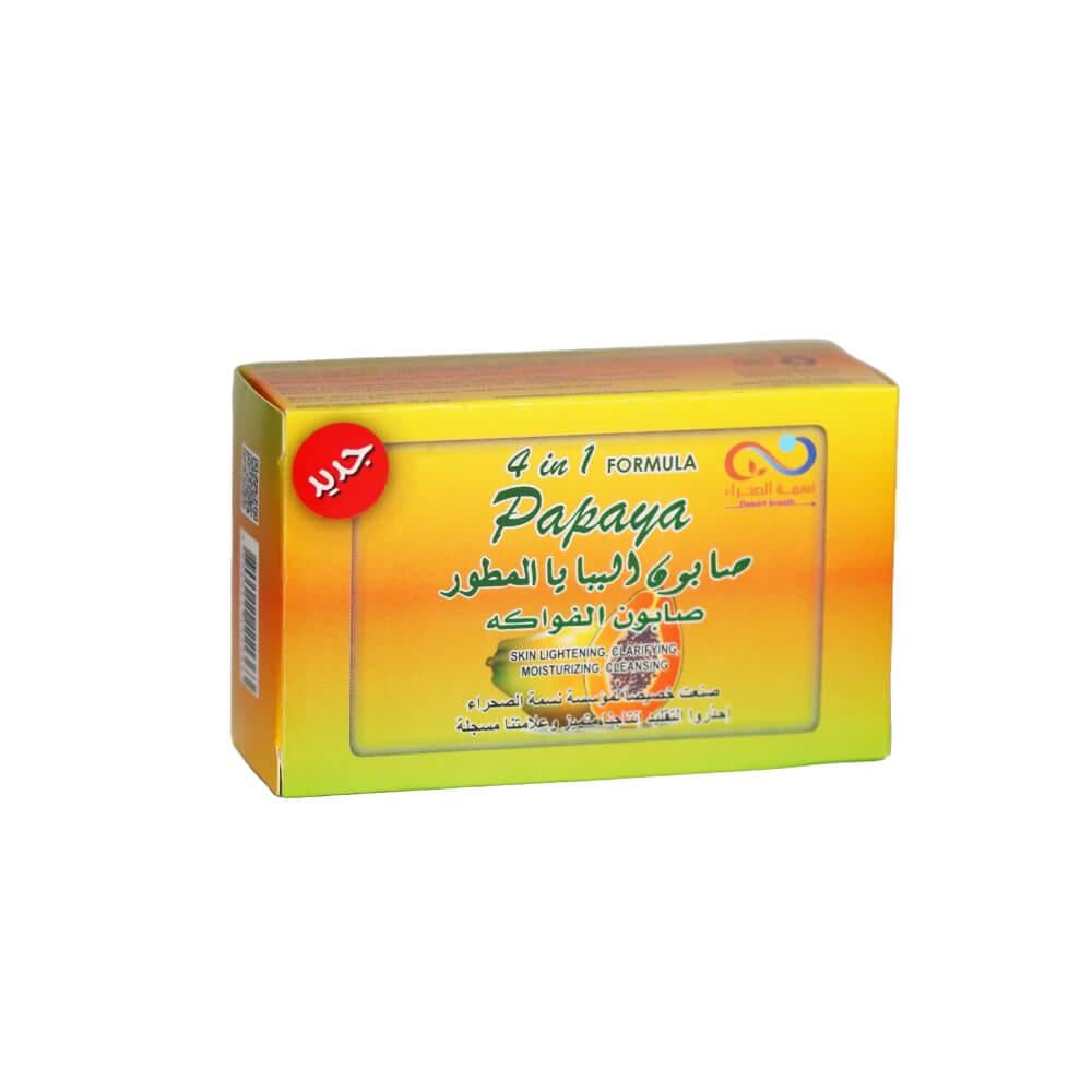 صابون “نسمة الصحراء” المطور بالبابايا والفواكه هو منتج طبيعي للعناية بالبشرة، يتميز بتركيبته الغنية بمستخلصات البابايا والفواكه التي تغذي البشرة وتمنحها نعومة وإشراقًا طبيعيًا. تعمل البابايا كمقشر طبيعي للبشرة، مما يساعد على إزالة الخلايا الميتة وتجديد البشرة، بينما تساهم الفواكه في ترطيب وتفتيح البشرة بلطف، مما يجعلها ناعمة ونضرة.