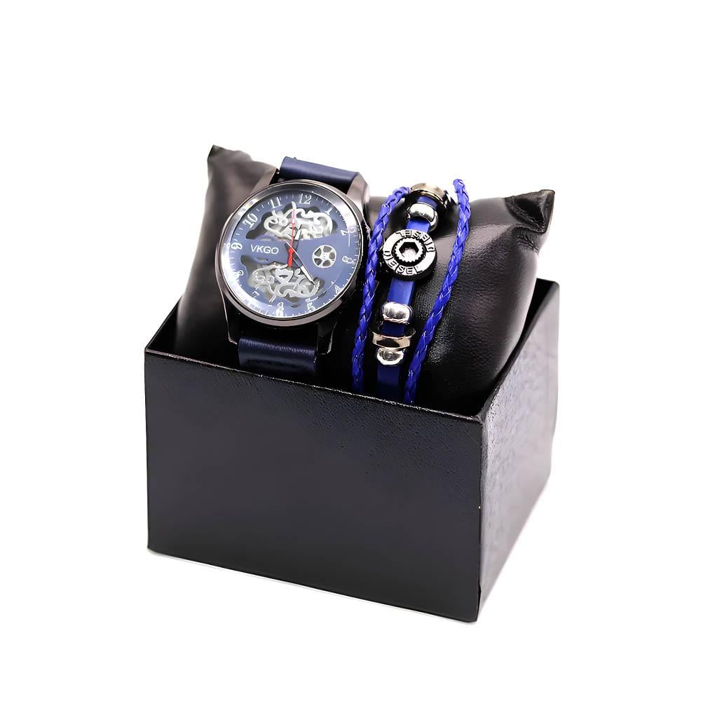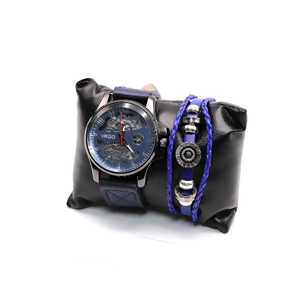 طقم فاخر للرجال يتضمن ساعة جلدية كاجوال وأسوارة أنيقة باللون الأزرق. يجمع هذا الطقم بين الأناقة والراحة، مما يجعله الخيار المثالي للإطلالات اليومية والعملية.