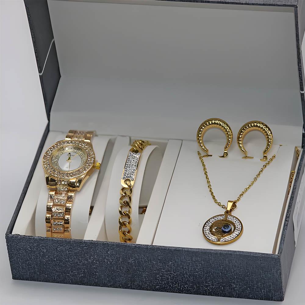 طقم متكامل: يتضمن ساعة، سلسال، حلق، وأسوارة لتكمل إطلالتك بشكل مثالي.