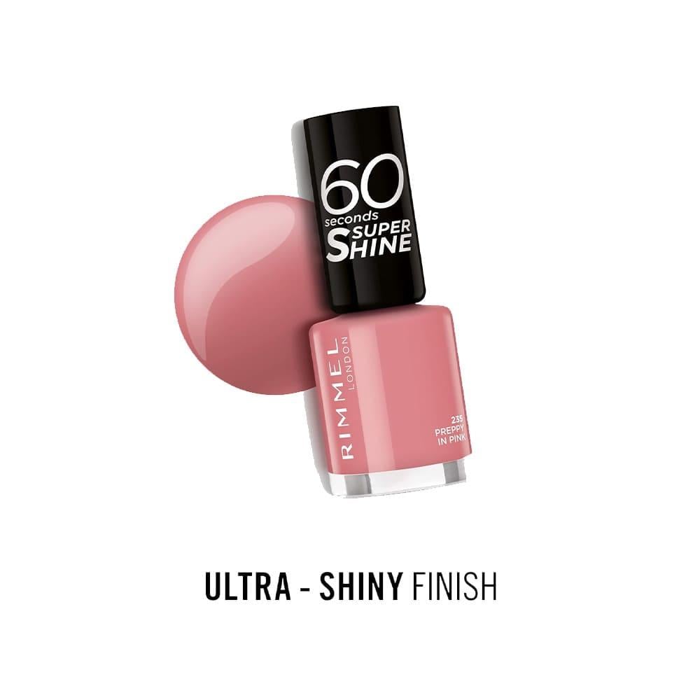ريميل لندن طلاء أظافر 60 سكندز سوبر شاين باللون 235 بريبي إن بينك يتميز بتركيبة تجف بسرعة وتمنح لمعانًا فائقًا.