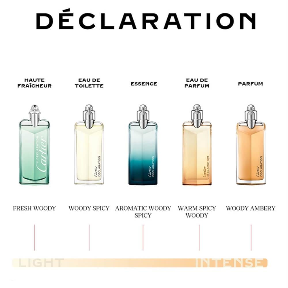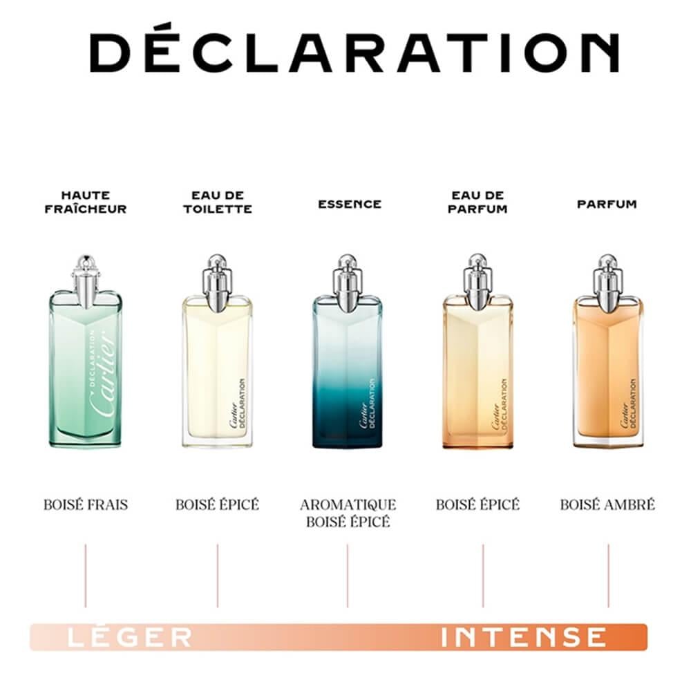 عطر ديكلاريشن من كارتيه حامضي أروماتي للرجال. تم إصدار عطر ديكلاريشن عام 2001. العطر يبدأ برائحة الليمون والجير فى جو حمضي ملييء بالطاقة بينما يفسح الطريق أمام زهور البرتقال وأوراق الشاي ليقلل من تركيزهم بشيء أكثر نعومة وزهرية. يكمل الجيرانيوم الأحمر واللافندر النزعة النباتية بينما الصنوبر الدافيء والمسك الشهواني يصنع عنصر مغري ساحر وقوى . أخيرا، نجيل الهند وخشب الصندل يمنحوا حلاوتهم الأرضية لعطر خفيف وهوائي الذي يعيد إلى الأذهان السير لمسافات طويلة فى الأجواء الريفية.