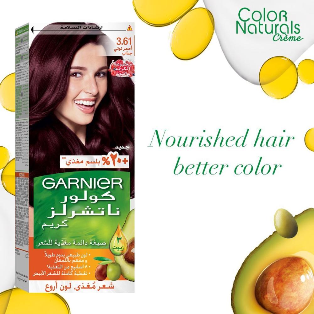 غارنييه كولر ناتشورالز صبغة شعر تقدم تغطية مثالية للشعر الأبيض ولون غني يدوم طويلاً. تحتوي الصبغة على بلسم مغذي مكون من مزيج من 3 زيوت طبيعية (زيت الزيتون، زيت الأفوكادو، وزيت الشيا) الذي يساعد في تغذية الشعر وحمايته خلال عملية الصبغ. تمنح الصبغة شعرك لمعانًا ونعومة مع لون طبيعي وجذاب.