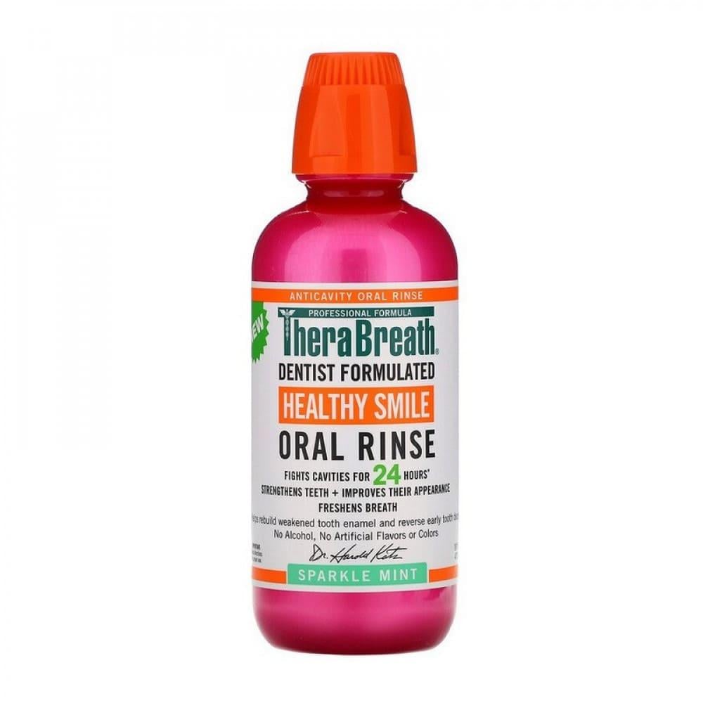 ثيرابريث غسول فم سباركل مينت لابتسامة صحية 473 مل هو غسول فم مطهر من ماركة ثيرابريث الأمريكية. تم اعتماده من جمعية طب الأسنان الأمريكية وأصبح أحد علاجات الفم الأكثر مبيعاً في أمريكا لعلاج رائحة الفم الكريهة.
