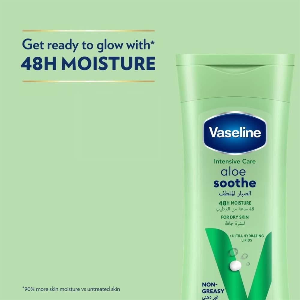 فازلين لوشن للعناية المركزة الملطف بالصبار يحتوي على الصبار المعروف بتهدئة وتلطيف البشرة الجافة المتهيجة ويتم امتصاصه بسرعة لكي لا يترك شعورًا دهنيًا مناسب للبشرة الجافة والبشرة المُصابة بالحكة والبشرة المُصابة بالجفاف المصحوب بحروق الشمس.