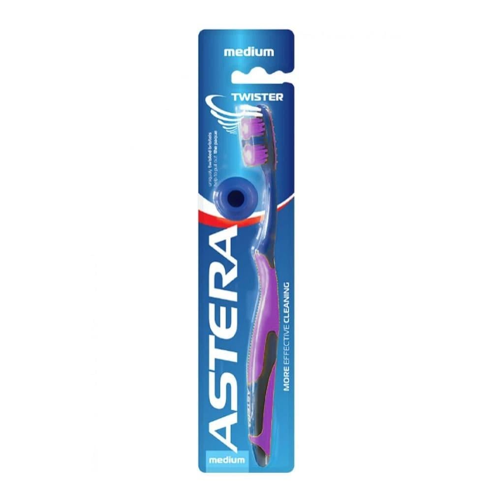 استيرا تويستر فرشاة أسنان شعيرات متوسطة النعومة هي فرشاة أسنان مصنعة في السعودية من قبل شركة أستيرا لمنتجات العناية الشخصية. تتميز الفرشاة بشعيرات متوسطة النعومة، مما يجعلها مناسبة للأشخاص الذين لديهم أسنان حساسة أو اللثة الرقيقة. كما أن الشعيرات ملتوية بشكل فريد، مما يوفر تنظيفًا أكثر فعالية للأسطح الخارجية والداخلية للأسنان.