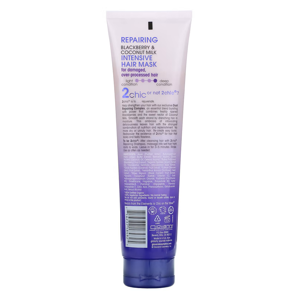يحتوي قناع الشعر المكثف للاصلاح من جيوفاني على مزيج أساسي مفعم بالقوة يجمع بين التوت الأسود الناضج الطازج والرحيق الحلو لحليب جوز الهند. يساعد على تجديد الشعر وتغذيته عن طريق ترطيبه وحمايته. قناع 2chic Repairing Intensive Hair Mask للشعر الجاف تزرع أقوى مزيج من التغذية والتجديد. لا مزيد من الشعر الجاف أو الجامح. أعيدي تكوين خصلات شعرك المثيرة. استخدميه أسبوعياً للتأكد من أن شعرك يبدو بلا عيوب.لن يبهت قناع إصلاح الشعر هذا أو يزيل لونه أو يتلفه. إنه آمن 100٪ على الألوان ، وخالٍ من البارابين ، وخالٍ من القسوة.