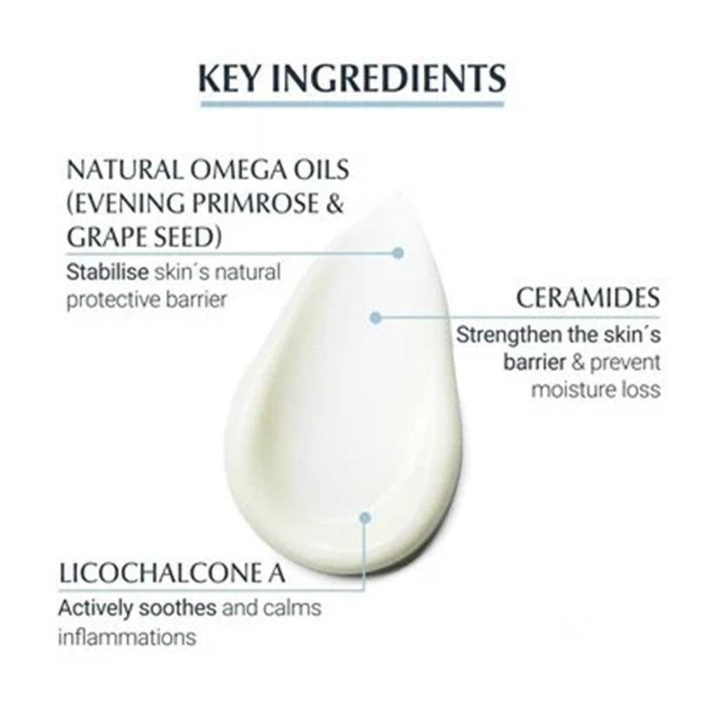 استخدام مكونات نباتية، فإن التركيبة التي تحتوي على مزيج من أحماض أوميغا الدهنية عالية التركيز (زيت زهرة الربيع المسائية وزيت بذور العنب) ومستخلص عرق السوس المهدئ تغذي البشرة،