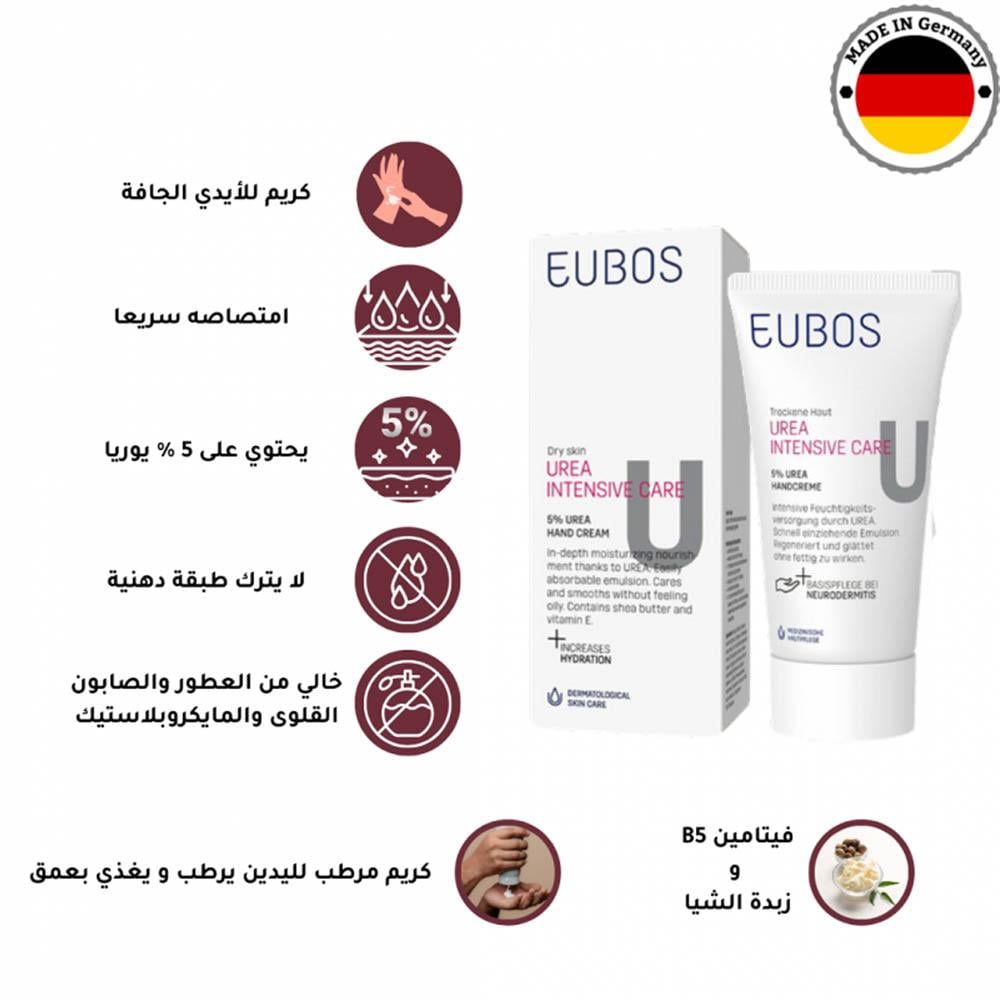 • يرطب الأيدي الجافة بعمق بفضل 5% يوريا التي تحافظ على توازن الرطوبة في البشرة.