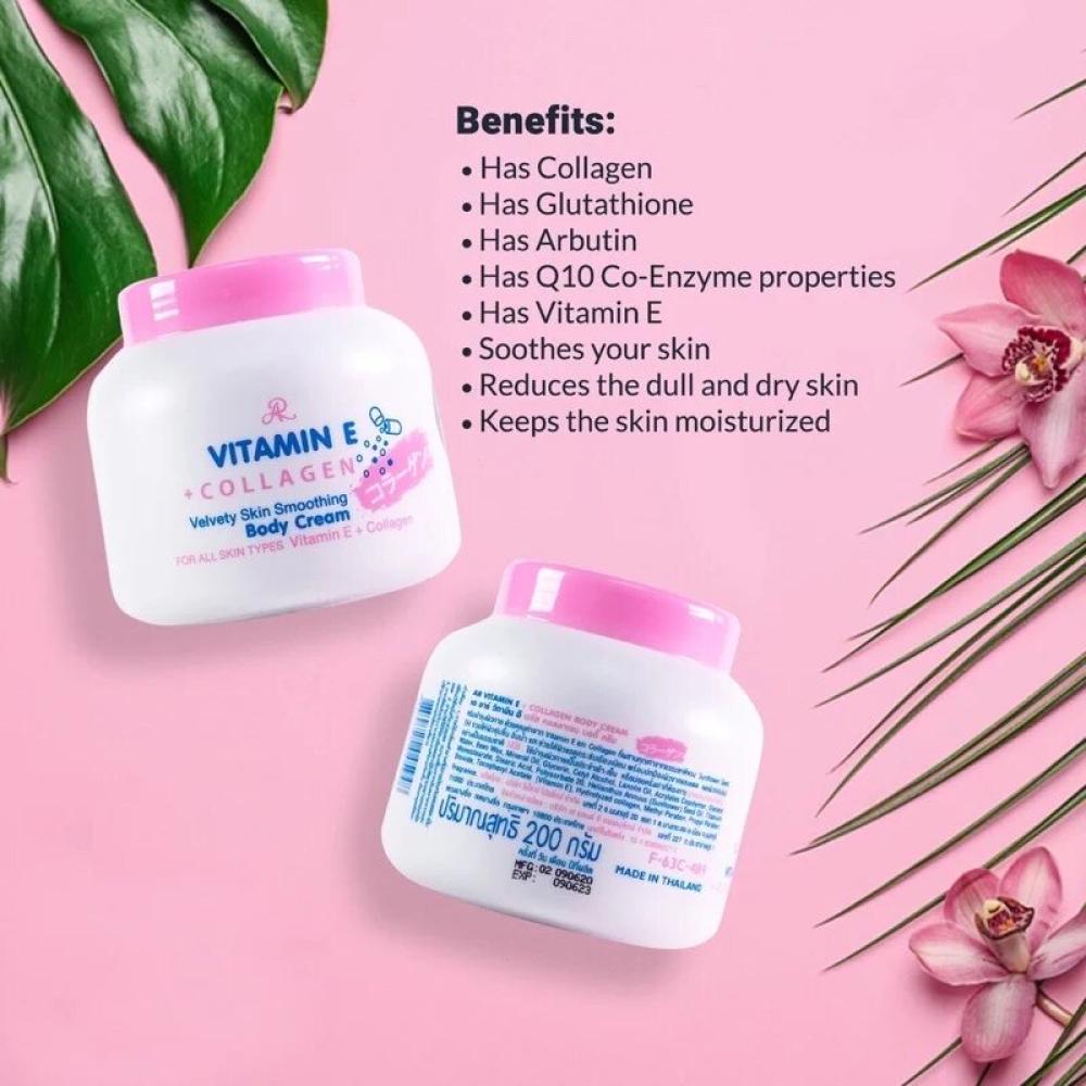 كريم فيتامين E مع الكولاجين لجميع أنواع البشرة يعمل على ترطيب البشرة ويُساعد على إظهار البشرة كبشرة الأطفال ناعمة، ومشرقة، ورطبة، وشابةً، ومُفعمة بالحيوية والنضارة، إذ أنّهُ عندما تقل نسبة الكولاجين في الجسم تقل مرونة الوجه أو البشرة، وتبدأ علامات التقدم في السن بالظهور شيئاً فشيئاً.