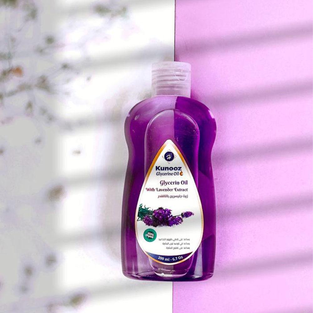 كنوز اتش زيت الجلسرين باللافندر هو منتج للعناية بالبشرة والشعر مصنوع من الجلسرين النقي وزيت اللافندر.