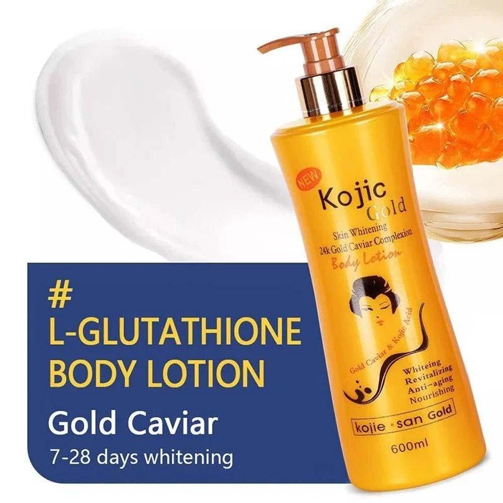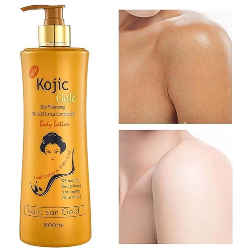 لوشن الجسم كوجي سان جولد لتبييض البشرة من الذهب عيار 24 قيراطاً ومن الكافيار آمن ومثالي ومفيد يحتوي على مزيج من المكونات الطبيعية – حمض كوجيك المعروف بتأثيره التبييض وزيت الورد للمساعدة على الشفاء تهدئة البشرة المتهيجة أو المندبة وتنعيم لون البشرة غير المتكافئ غني بالكولاجين وفيتامين هـ لبشرة شابة وصحية يفيد الكافيار الذهبي وحمض الكوجيك في تفتيح البشرة ويقلل من البقع الداكنة ويسيطر على فرط التصبغ ويقلل من عيوب البشرة الظاهرة يعيد ليونة البشرة ويترك البشرة مرطبة خالية من البارابين.