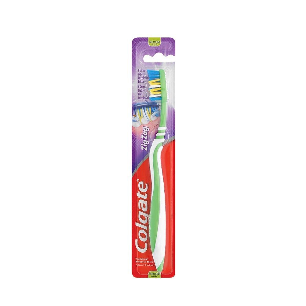 فرشاة أسنان بتصميم متعرج من كولجيت بحجم متوسط مع منظف اللسان لديها شعيرات على شكل V متعرج لتصل بين الأسنان ومصممة لإزالة البلاك بين الأسنان. تحتوي فرشاة الأسنان على طرف تنظيف مرتفع للوصول إلى البلاك وإزالته من الأسنان الخلفية حيث تصل إلى التجاويف بشكل أكبر. يوصي أطباء الأسنان بتغيير فرشاة أسنانك كل 3 شهور.