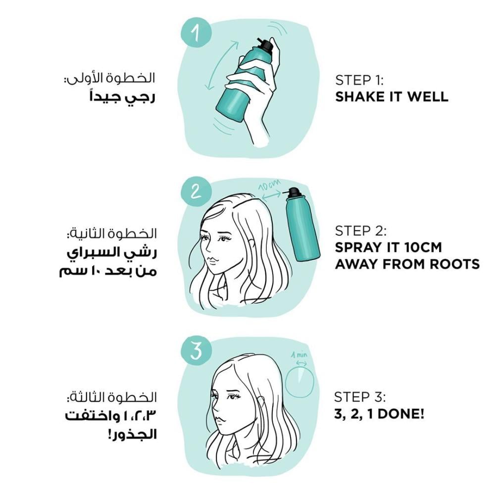 يتم رشه على الشعر من مسافة 10 سم من الجذور.