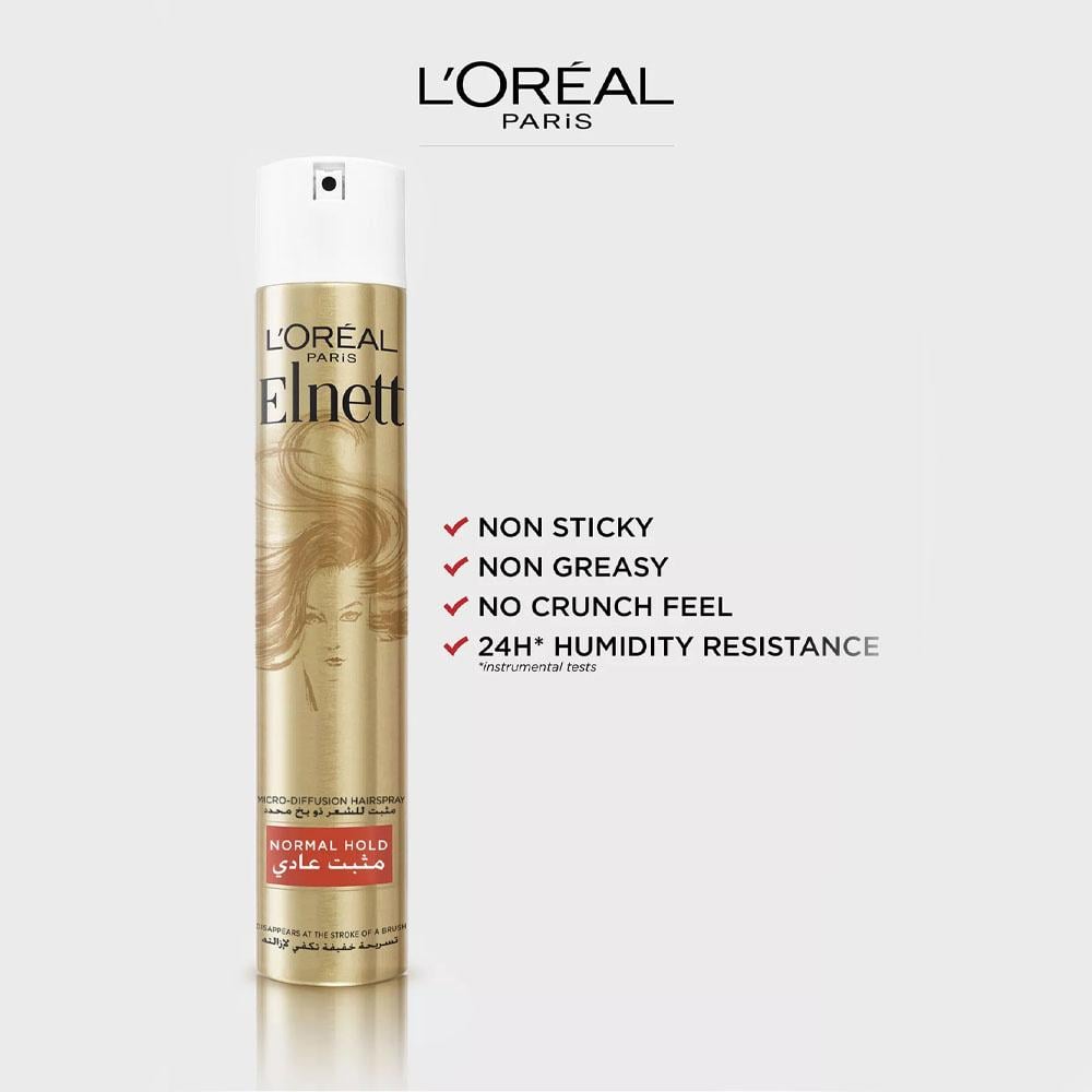تمنحك Elnett تسريحة شعر تدوم طويلاً ويمنح شعرك لمعاناً قوياً وملمساً ناعماً. تمتاز العبوة ببخاخ دقيق للغاية لدرجة أنّ يختفي عن الشعر بضربة فرشاة ويترك شعرك نظيفاً وناعماً ويفيض لمعاناً. حافظي على تسريحة شعرك مع تماسك مثالي للشعر يدوم طويلاً.
