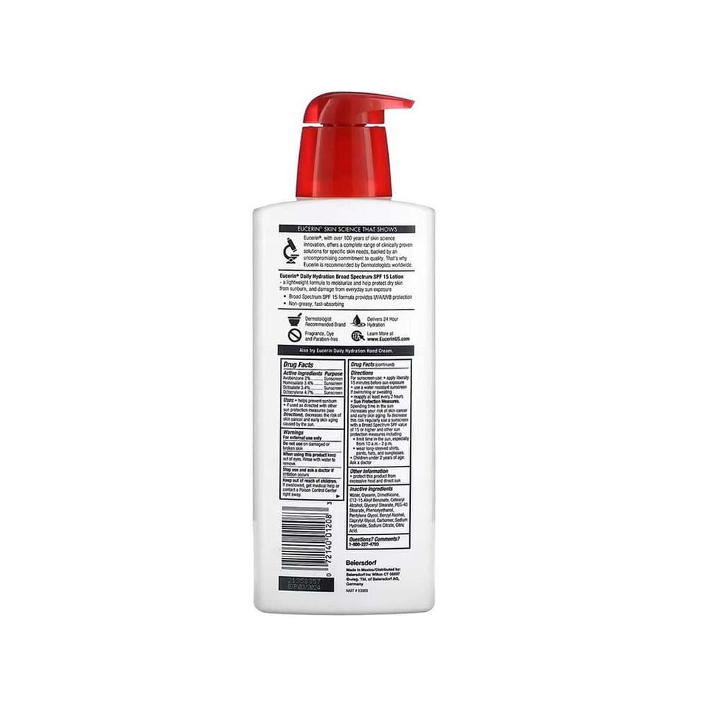 يوسرين لوشن الترطيب اليومي مع SPF 15 هو مستحضر خفيف الوزن وغير دهني، مصمم خصيصًا لترطيب البشرة الجافة وحمايتها من أشعة الشمس. يجمع بين الترطيب طويل الأمد والحماية من أشعة UVA/UVB، مما يساعد على الوقاية من الجفاف وعلامات التقدم في السن الناتجة عن التعرض للشمس. يحتوي على مكونات مغذية تعزز حاجز الترطيب الطبيعي للبشرة.