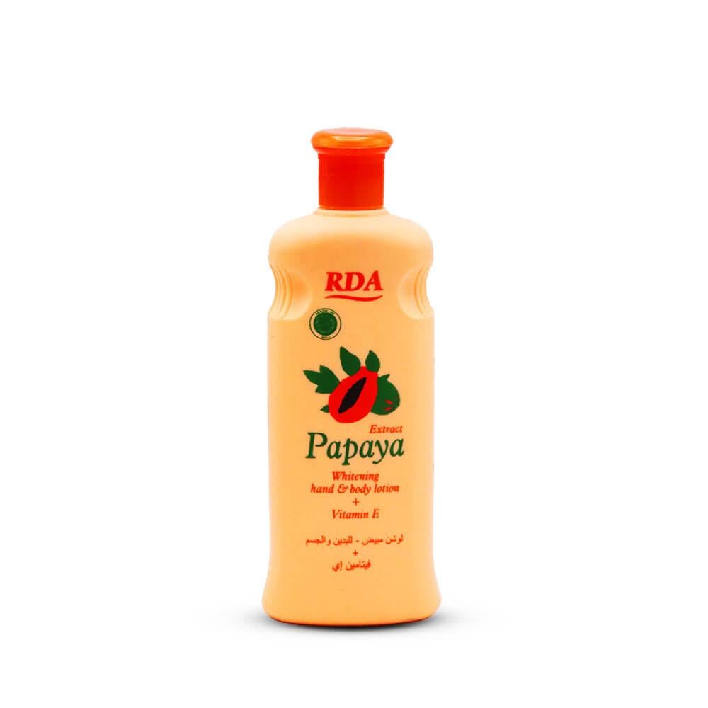 لوشن البابايا للجسم واليدين من RDA هو منتج يهدف إلى تفتيح وترطيب البشرة، مع تركيبة غنية بمستخلصات البابايا التي تساعد على تفتيح لون البشرة وتوحيد لونها.
