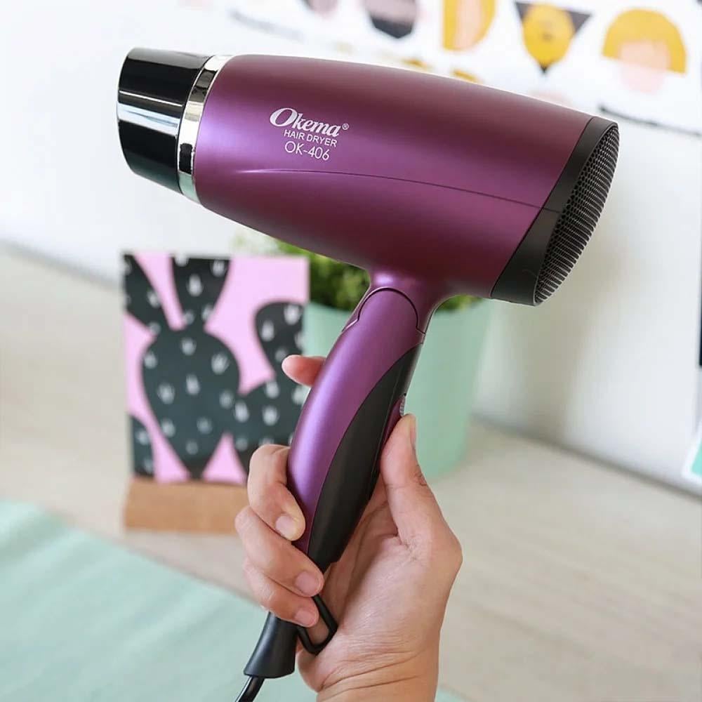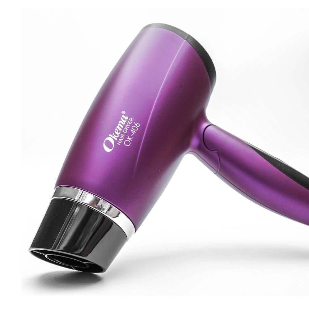 احصلي على نتائج تجفيف احترافية بسرعة مع مجفف الشعر OK-406 من اوكيما الذي يعمل بقوة 2200 واط والمزود بتقية الايونية المضادة للكهرباء الساكنه لشعر شديد اللمعان وخالي من التجعيد بنتائج احترافية