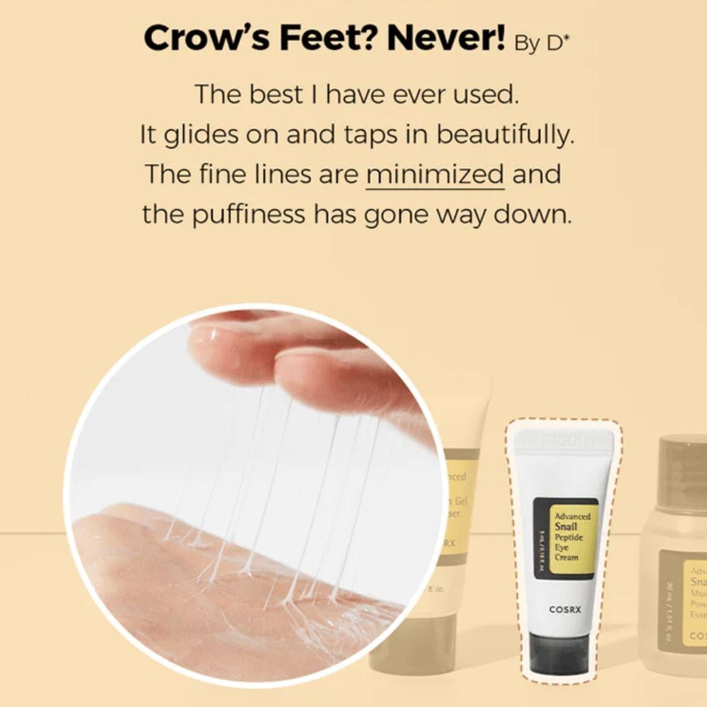 - كريم متطور للعين بخلاصة الببتيد والحلزون ضعي كمية مناسبة حول منطقة العين. ربتي بلطف بأطراف الأصابع لامتصاص سريع.