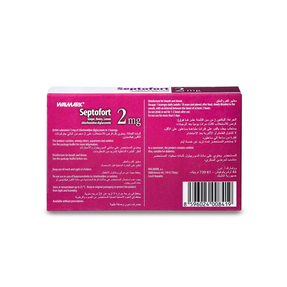 سيبتوفورت 2 مغ مطهر للفم والحلق بالزنجبيل والعسل والليمون هو منتج يستخدم لتطهير الفم والحلق وتخفيف التهاباتها وتهيجها. يحتوي على مكونات طبيعية مثل الزنجبيل والعسل والليمون التي تساهم في تهدئة الحلق وتخفيف الالتهابات.