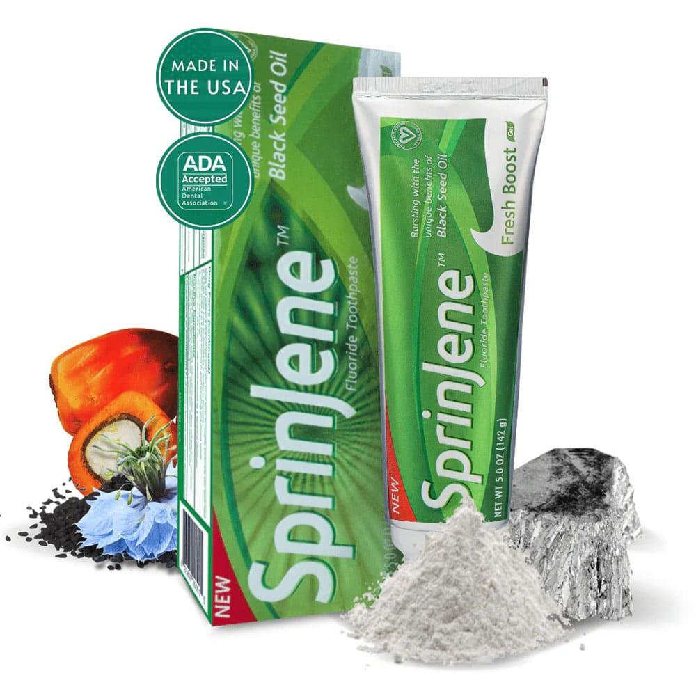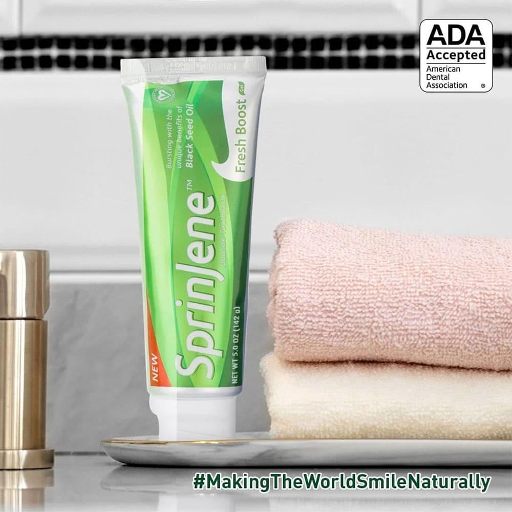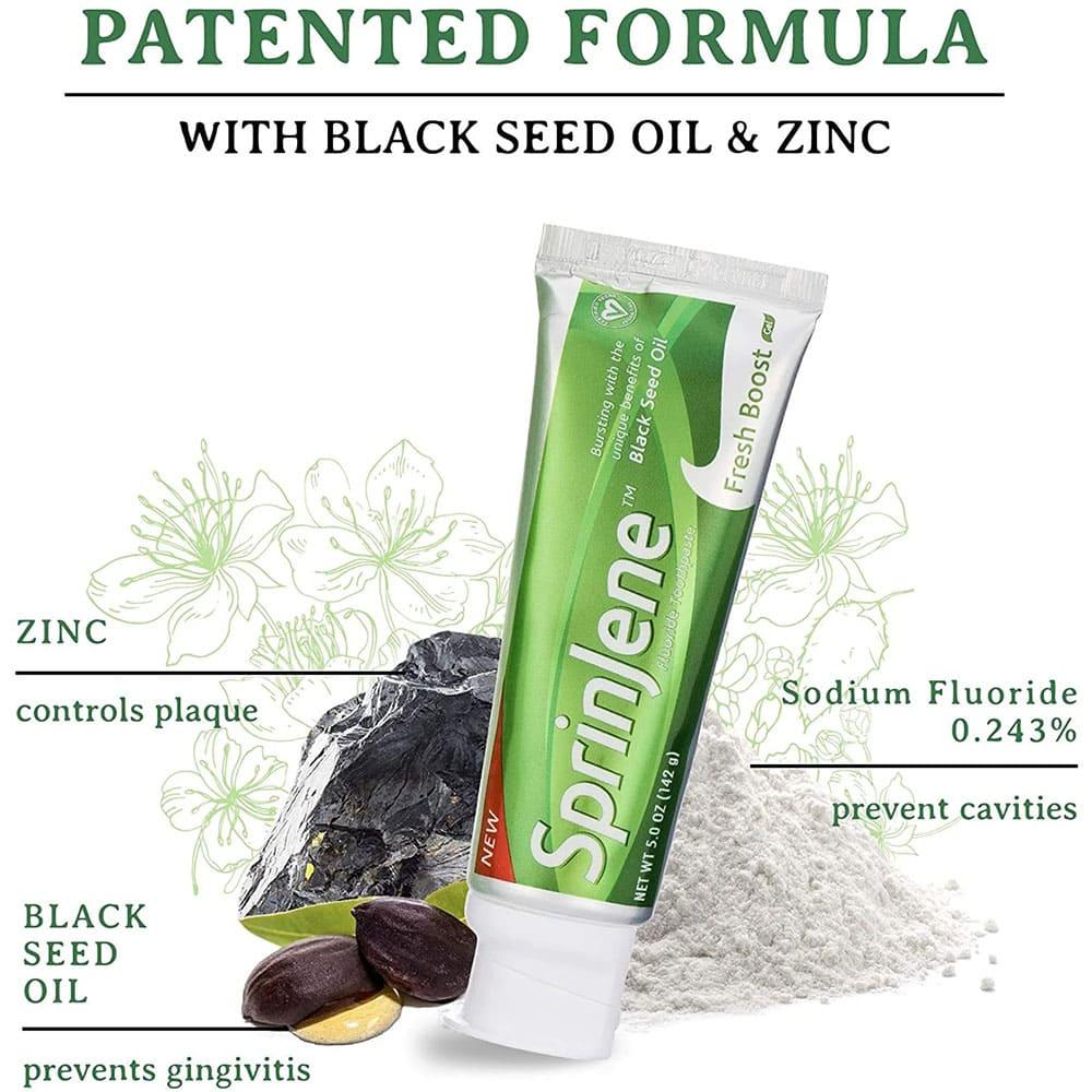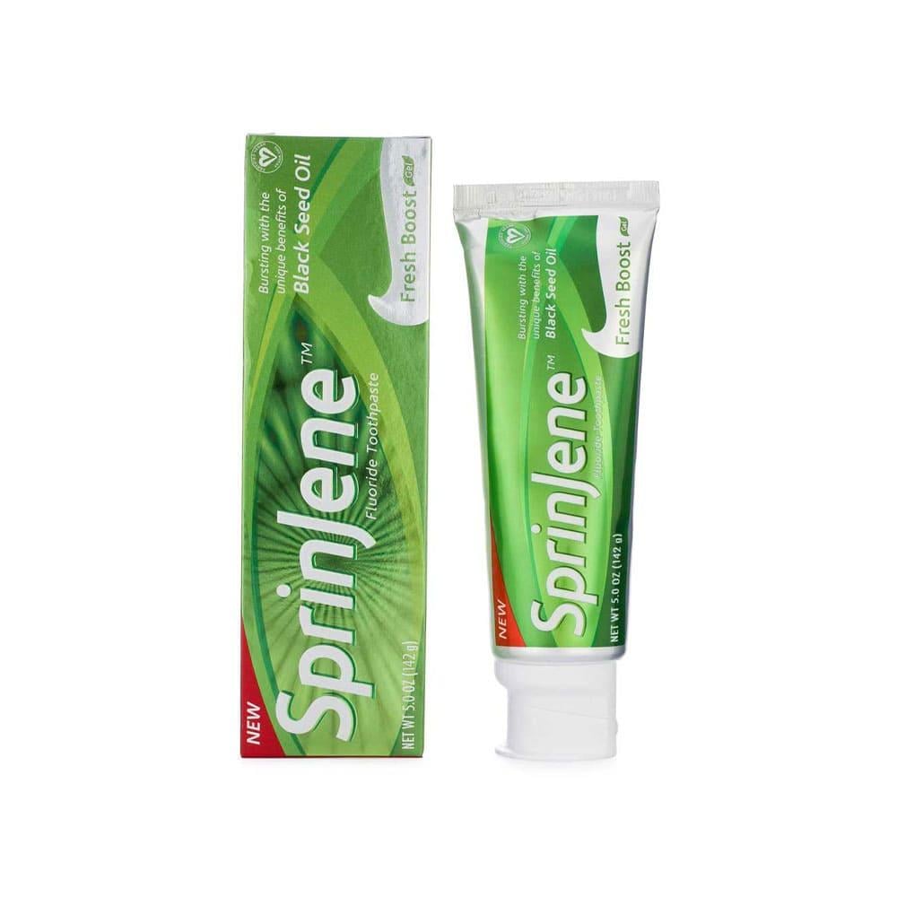 سبرينجين معجون أسنان فريش بوست بزيت حبة البركة السوداء – 142 جم هو معجون أسنان مصمم خصيصًا ليجمع بين فوائد العناية بالفم وقوة زيت حبة البركة السوداء. يعتبر هذا المعجون اختيارًا مثاليًا للحصول على تنظيف عميق ومنعش للفم، بالإضافة إلى دعم صحة الأسنان واللثة بفضل المكونات الطبيعية الفعالة.