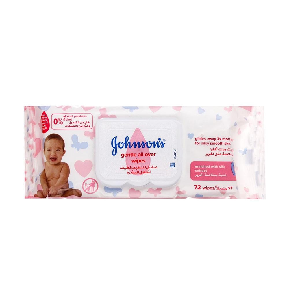 جونسون مناديل لتنظيف لطيف لكامل بشرة الاطفال 72 منديل هي مناديل مضادة للحساسية يمكن استخدامها لتنظيف جسم الطفل بالكامل ، حتى الوجه و بدون حرق العينين مع تقنية لا دموع بعد اليوم ، يمنع التهيج والطفح الجلدي ، مما يترك بشرة الطفل رطبة ويحافظ على حواجز الجلد الطبيعية.