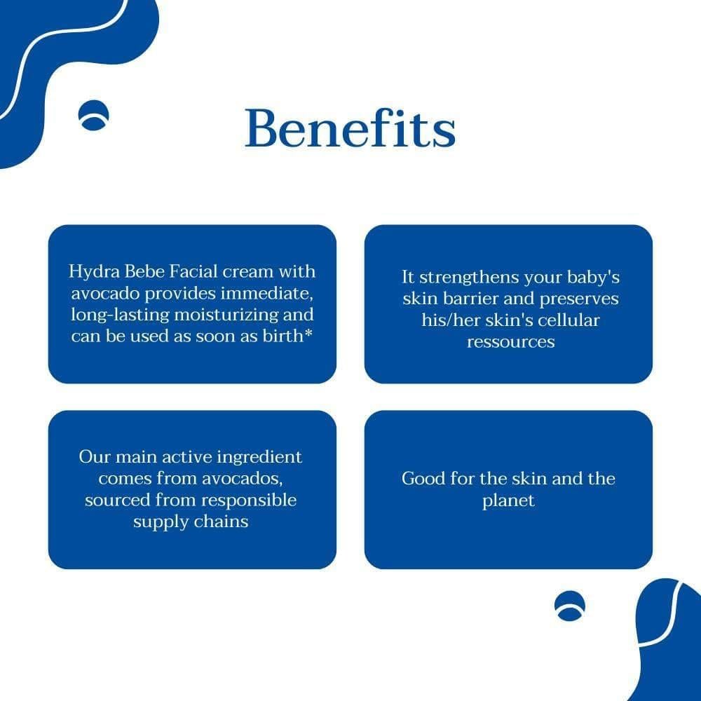 الوصف:كريم الوجه هيدرا بيبي ابتكر خصيصاً ليرطب بشرة الطفل و يعمل على تقويتها منذ اللحظات الأولى من ميلاد الطفل. فوائد المنتج:يعمل على ترطيب بشرة الطفل منذ اليوم الأول ( غني بفيتامين E , K ).صنع خصيصاً للحماية من اليوم الأول للطفل بعد الولادة.منتج تم فحصه من قبل أطباء الجلد و تم مراقبته من قبل أطباء الأطفال.خالي من البارابين و الباثاليت و الفينوكسيثانول. المميزات الخاصة في المنتج :مختبر من قبل أطباء الجلدية و الأطفال95% مواد طبيعية المنشأ.تركيبة عالية التحمل و غير مسببة للحساسية.خالي ممن البرابين ، و فثالات ، و الفينوكسيايثانول. تعليمات الاستخدام :يوضع هذا الكريم صباحًا و مساءاً على الوجه بعد تنظيفه.يمكنكِ استخدام كريم الوجه هيدرا بيبي مباشرة منذ اللحظات الأولى من ميلاد طفلك. التحذيرات :للاستعمال الخارجي فقط.يحفظ بعيدا عن متناول الأطفال.يحفظ في مكان بارد وجاف ، بعيداً عن أشعة الشمس المباشرة.