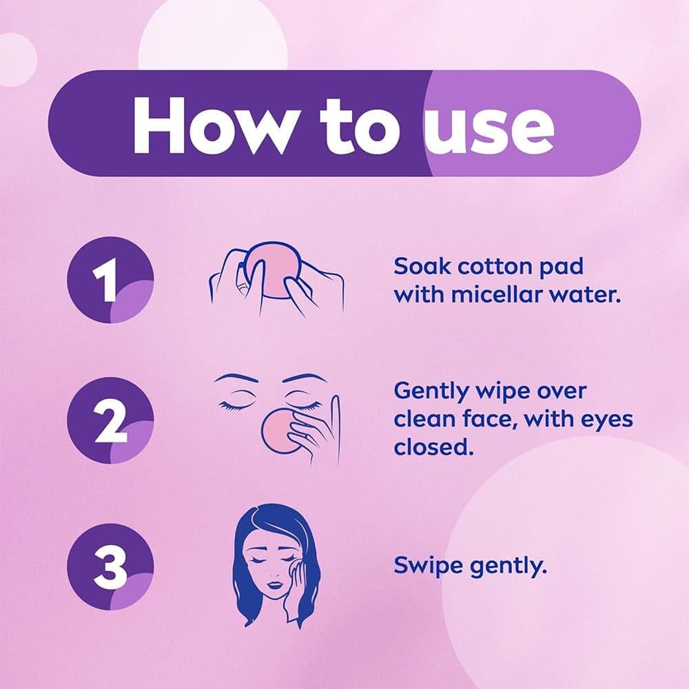 يُمسح الماء الميسيلار على الوجه والعنق باستخدام قطعة قطنية، مع التركيز على مناطق البشرة التي تحتوي على مكياج أو تراكم للشوائب.