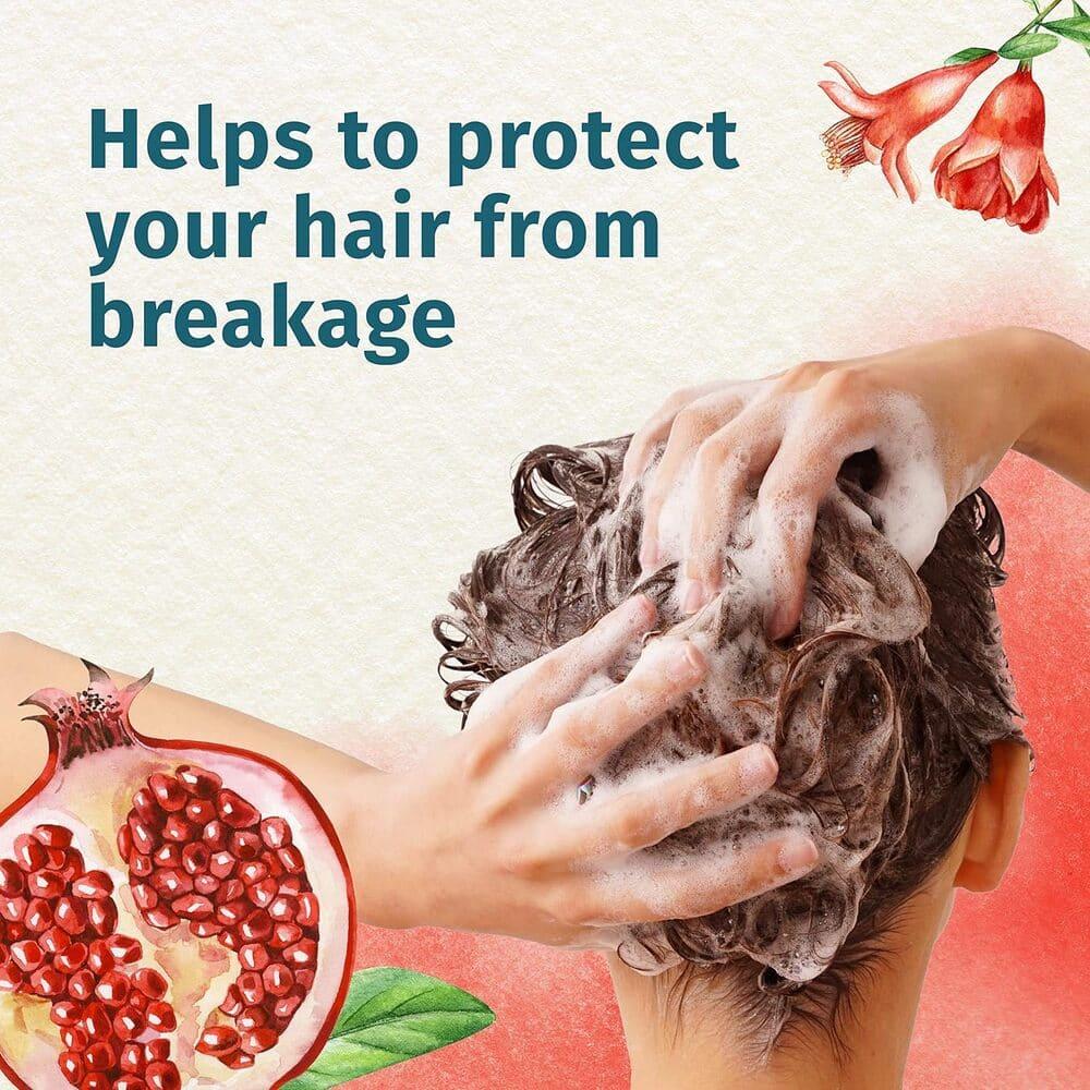 شامبو هيربل اسنسيس بخلاصة الرمان التركيبة الخاصة لترميم التلف حيث يعمل الرمان علي تعزيز بصيلات الشعر عن طريق تنشيط الدورة الدموية وتحسين تدفق الدم الي فروة الرأس ويعمل أيضا هيربل أسنسيس علي منع تساقط الشعر وزيادة كثافتة ومعالجة مشاكل القشرة المزعجة بالقضاء علي جفاف فروة الرأس ويعمل أيضا علي إمداد الشعر بالمعادن والفيتامينات الضرورية.