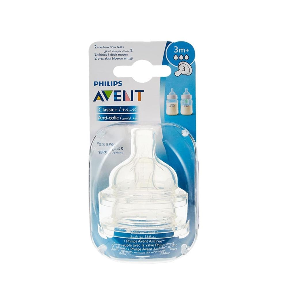 حلمات فيليبس أفنت كلاسيك+ ضد المغص متوسطة التدفق، يأتي في عبوة تحتوي على حلمتين، مصممة لتناسب زجاجات فيليبس أفنت وتلبي احتياجات الأمهات والرضع خلال فترة الرضاعة.